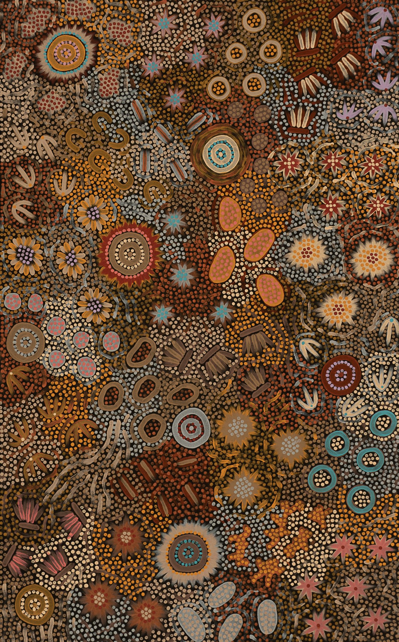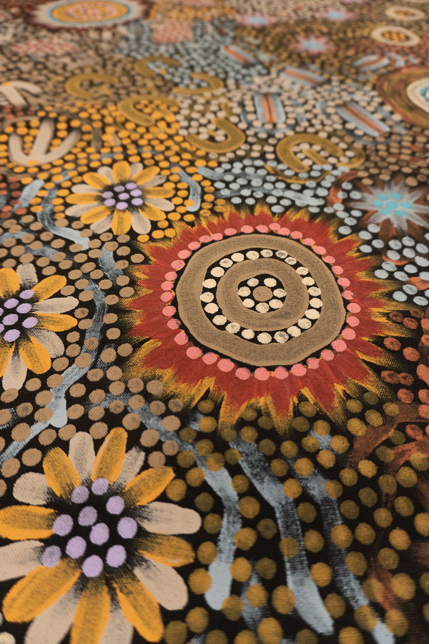 Each cluster of motifs—circles, pathways, tracks, and bursting floral forms—encodes specific knowledge, linking people, place, and ancestral narrative. The composition brings together multiple sites, stories and seasonal food sources, reflecting the interconnected nature of desert life.