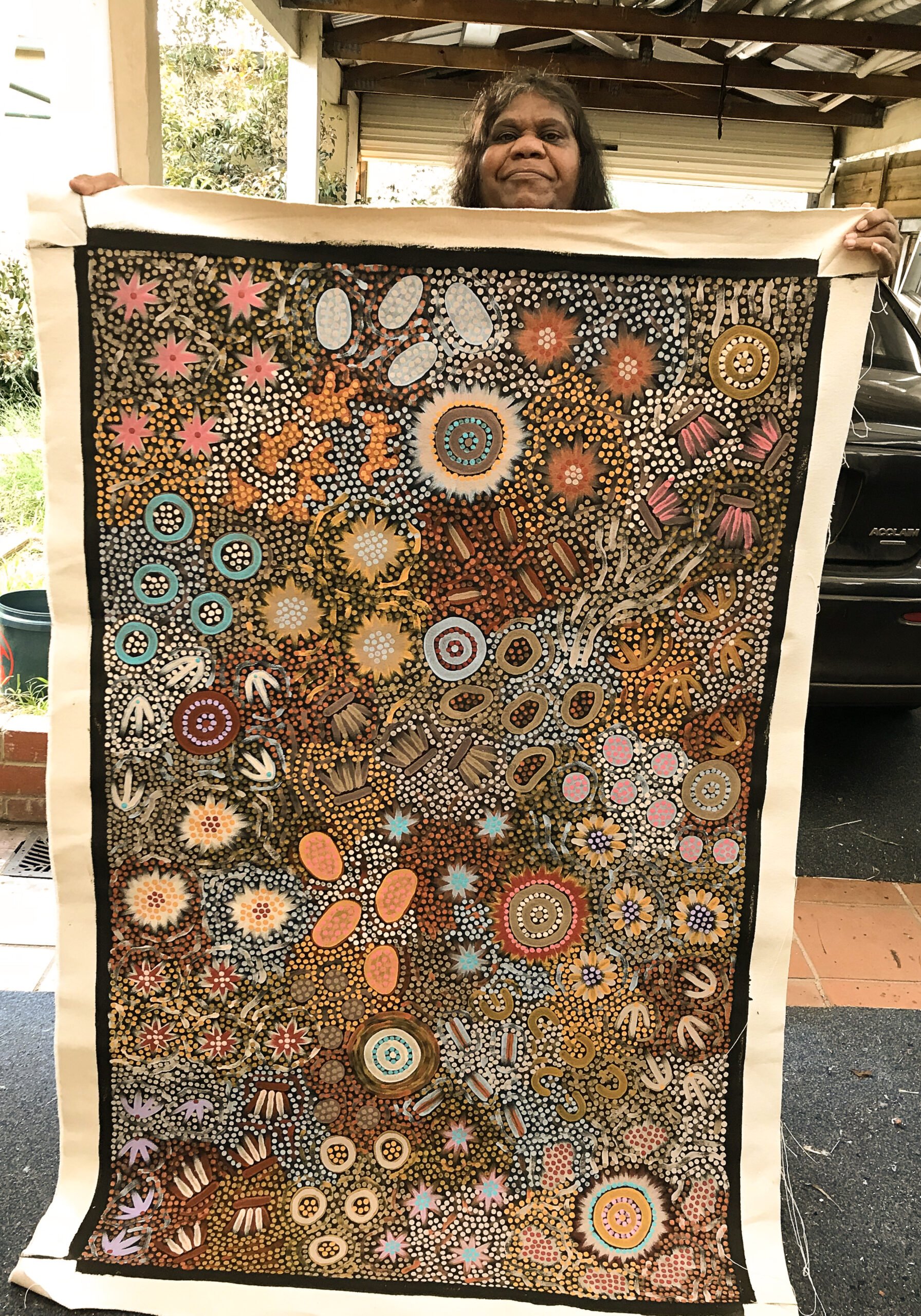 Throughout the painting, Michelle captures the features of her Grandmother’s Country: the shifting sandhills, freshwater soakages, dried salt pans and ancient rockholes carved into the bedrock—lifesaving water sources during long periods of drought. The landscape is dotted with desert vegetation including spinifex grass, wild bush wheat, honey flowers used for sugarbag (native bee honey), and underground bush foods such as sweet yams.