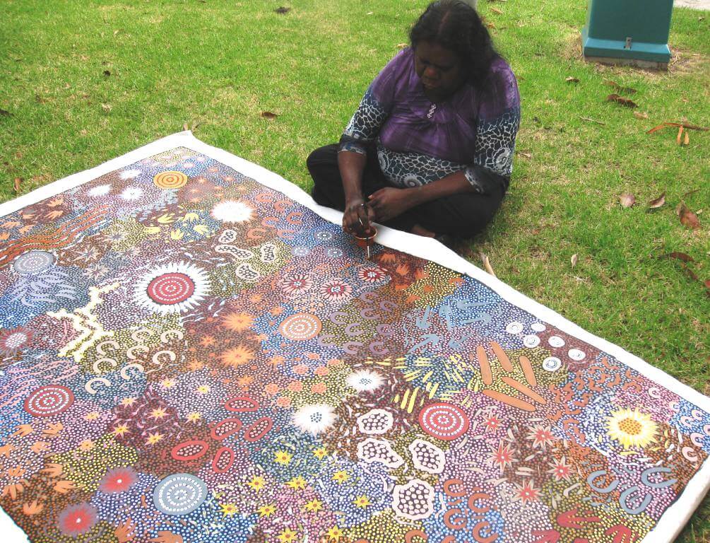 Michelle first exhibited with her father and sister in Brisbane in 1987, and at Cooee Gallery in Sydney 1992. Since that time, she has had huge exposure through Galleries within Australia and overseas. Her content includes Goanna Dreaming, Bush Coconut, and other bush tucker themes, however she is best known for her beautiful Women’s Dreaming series.