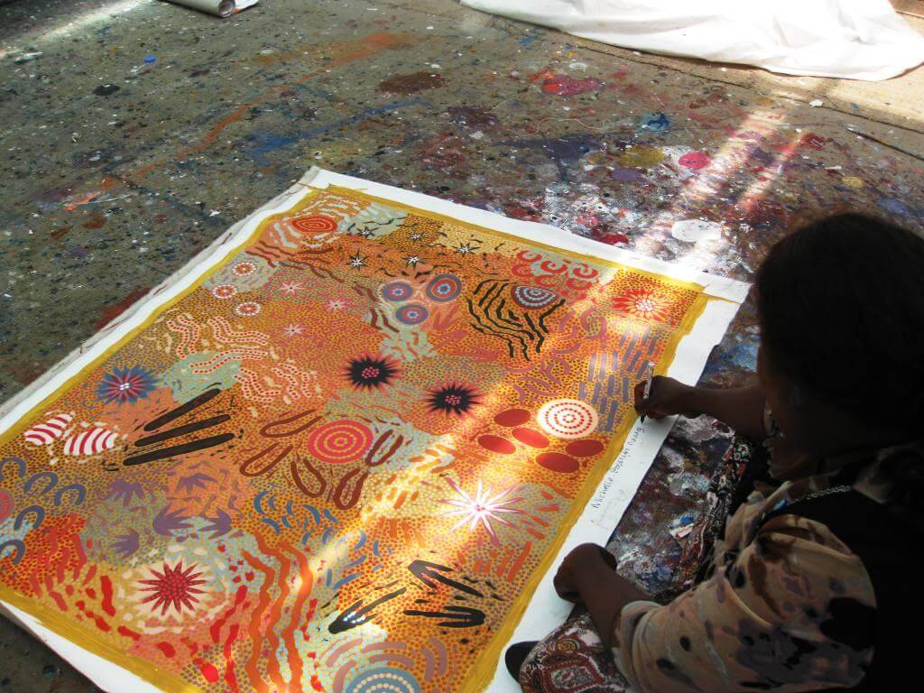 Michelle has been painting since a very early age, and whilst Clifford taught both his daughters technique, their styles differ considerably. Michelle’s works are colourful and dramatic in style, depicting the dreaming stories and women’s ceremonial activities of her paternal grandmother Long Rose Nungala, combined with the bold and precise imaging of her father’s works. Both Michelle and Gabriella joined their father in collaborative works, and carry on the legacy of the grass roots Papunya Tula art and associated cultural content.