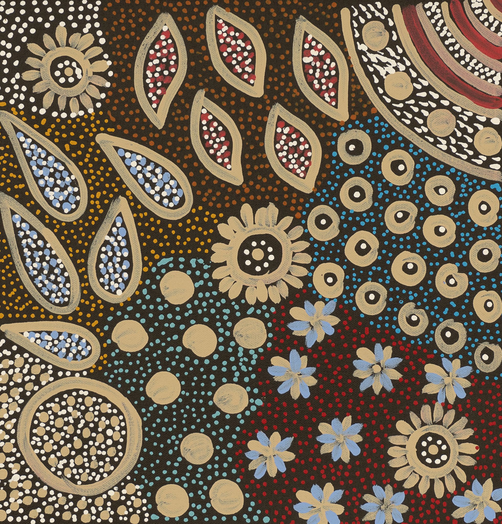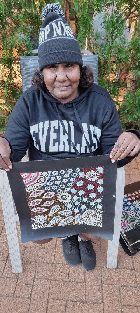 Her style is similar to the early works of her mother Anna with intricate dot work telling the story of her country and ceremonies.