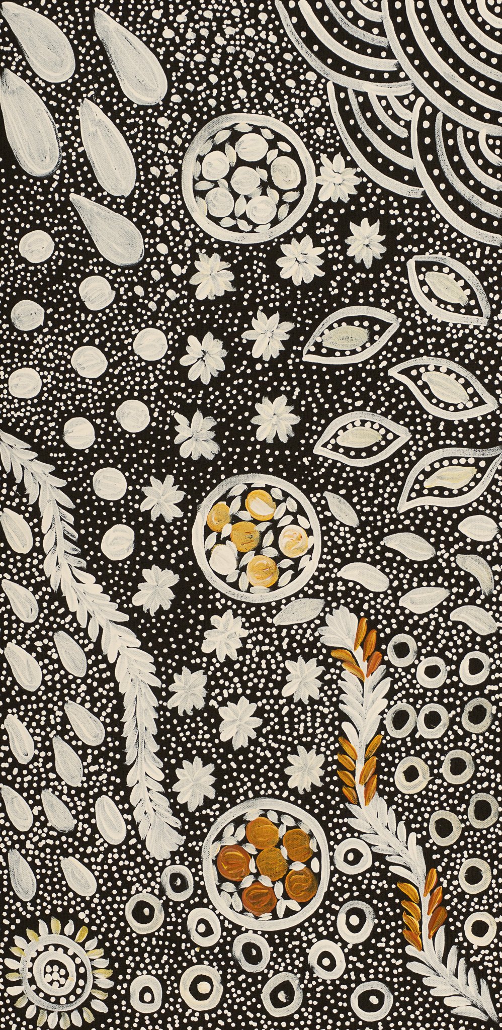Her style is similar to the early works of her mother Anna with intricate dot work telling the story of her country and ceremonies.
