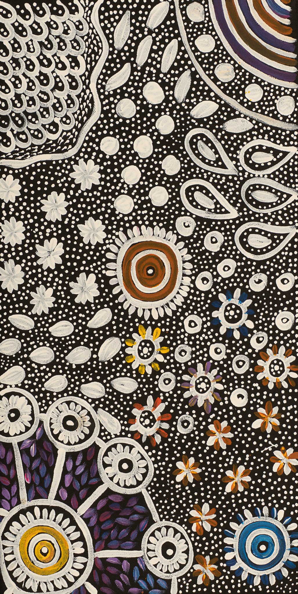 Naomi has cleverly combined a topographical view of her country along with the ceremonial stories related to bush medicine. Stories involving bush medicine depict the country surrounding the areas where the dreaming takes place, or where the ceremony is performed. The Bush Medicine Plant is an Australian native that grows wild in Central Australia. Women collect leaves from these plants; the leaves are boiled to extract resin. Kangaroo fat is mixed into the resin, creating a paste that can be stored for a long time in bush conditions. This medicine is used to heal cuts, wounds, bites and rashes. It is also used to treat the flu, headache, backache, upset stomach, chest pains or as an insect repellent. As the leaves and petals dry out, they fall off and are blown around by the wind. This is represented in the painting and gives it the movement.