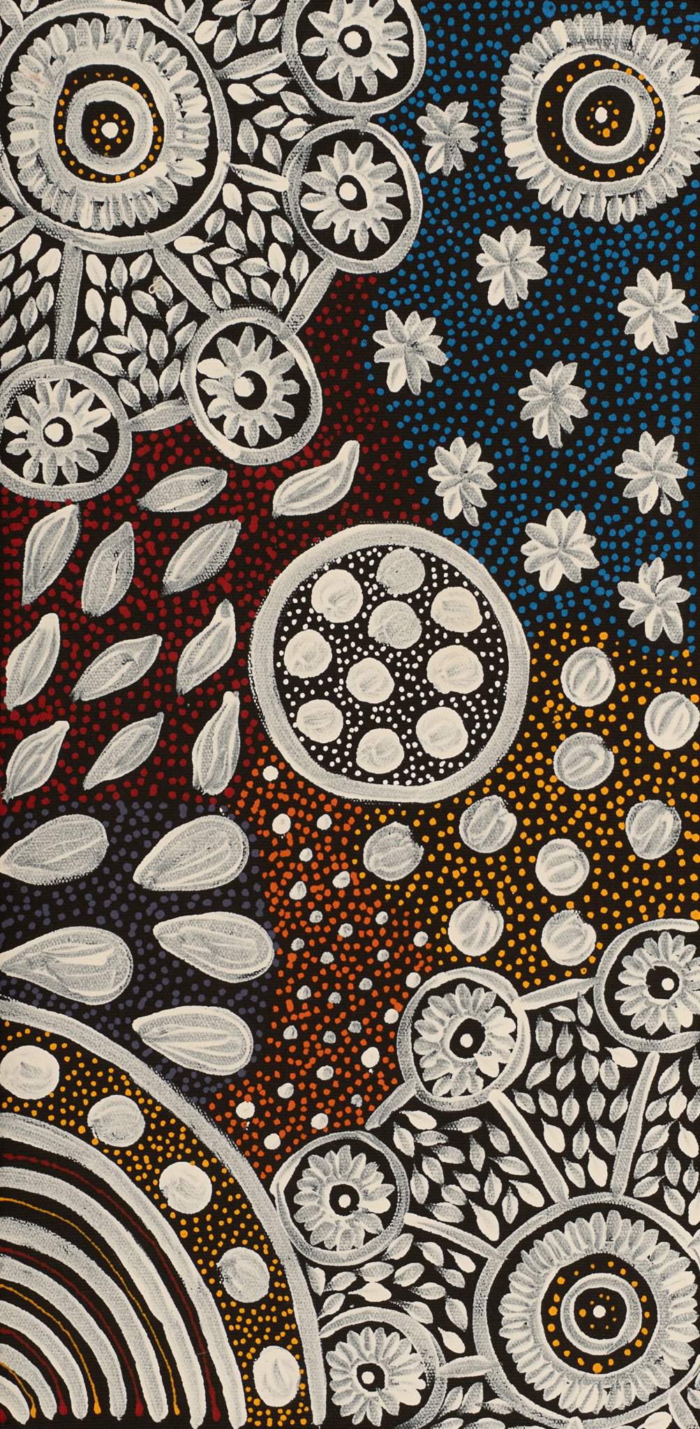 Naomi has cleverly combined a topographical view of her country along with the ceremonial stories related to bush medicine. Stories involving bush medicine depict the country surrounding the areas where the dreaming takes place, or where the ceremony is performed. The Bush Medicine Plant is an Australian native that grows wild in Central Australia. Women collect leaves from these plants; the leaves are boiled to extract resin. Kangaroo fat is mixed into the resin, creating a paste that can be stored for a long time in bush conditions. This medicine is used to heal cuts, wounds, bites and rashes. It is also used to treat the flu, headache, backache, upset stomach, chest pains or as an insect repellent. As the leaves and petals dry out, they fall off and are blown around by the wind. This is represented in the painting and gives it the movement.