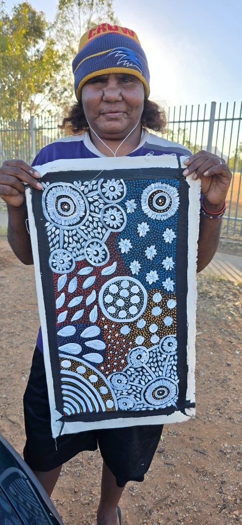Her style is similar to the early works of her mother Anna with intricate dot work telling the story of her country and ceremonies.