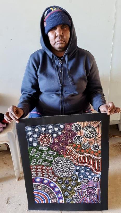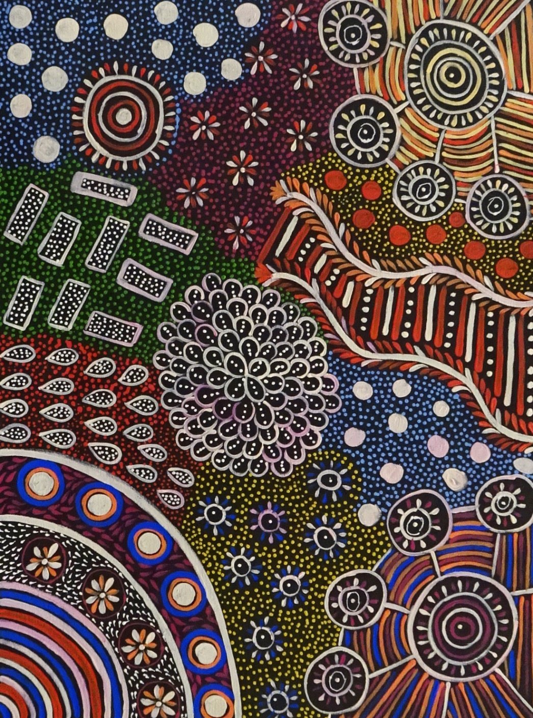Her style is similar to the early works of her mother Anna with intricate dot work telling the story of her country and ceremonies.