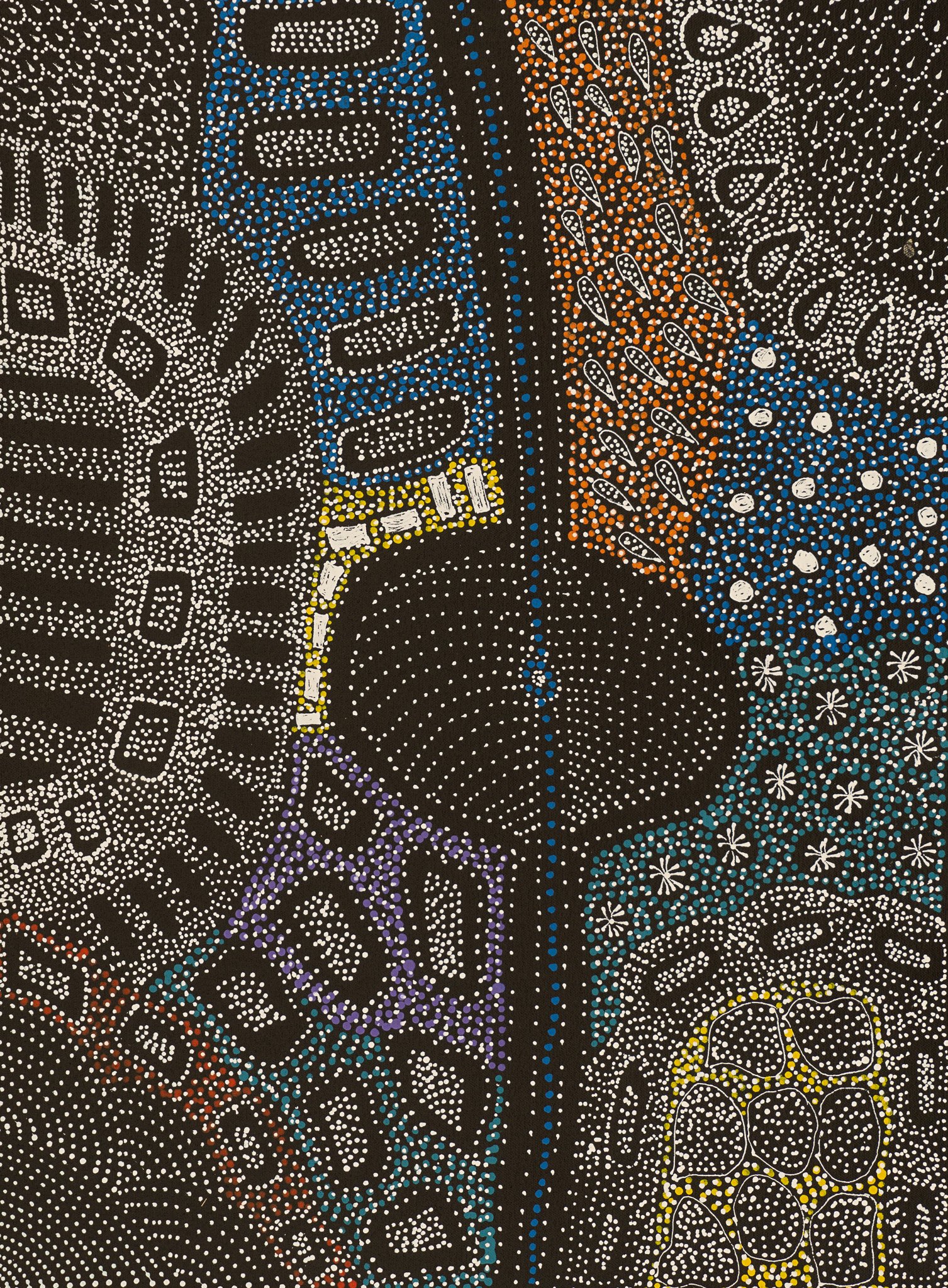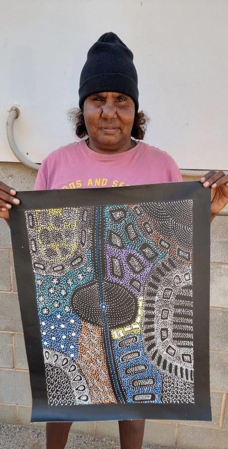 Her style is similar to the early works of her mother Anna with intricate dot work telling the story of her country and ceremonies.