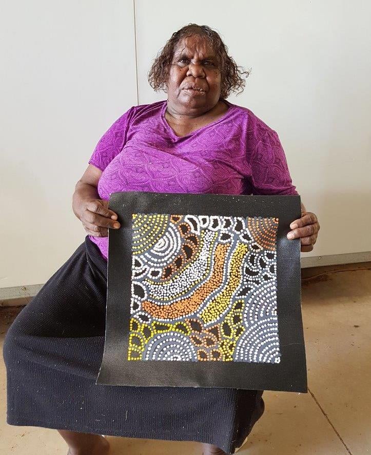 Painting in earthy tones she depicts women’s Lightning Dreaming, women’s ceremonies and women’s Tingari. One of Nellies better known stories is Kalimpinpa, which is the area she grew up in. The large rock hole at Kalimpinpa is a really deep rock hole. The men form a chain down to the water and scoop it up with a Coolamon and pass it up along the chain. This rock hole runs down under the ground and is difficult to access the water when there has been very little rain and the water level has dropped. Women’s body paint designs also feature heavily throughout Nellie’s artistic practice. Nellie enjoys experimenting with different colour palettes and has become incredibly confident in mixing colours for her works.