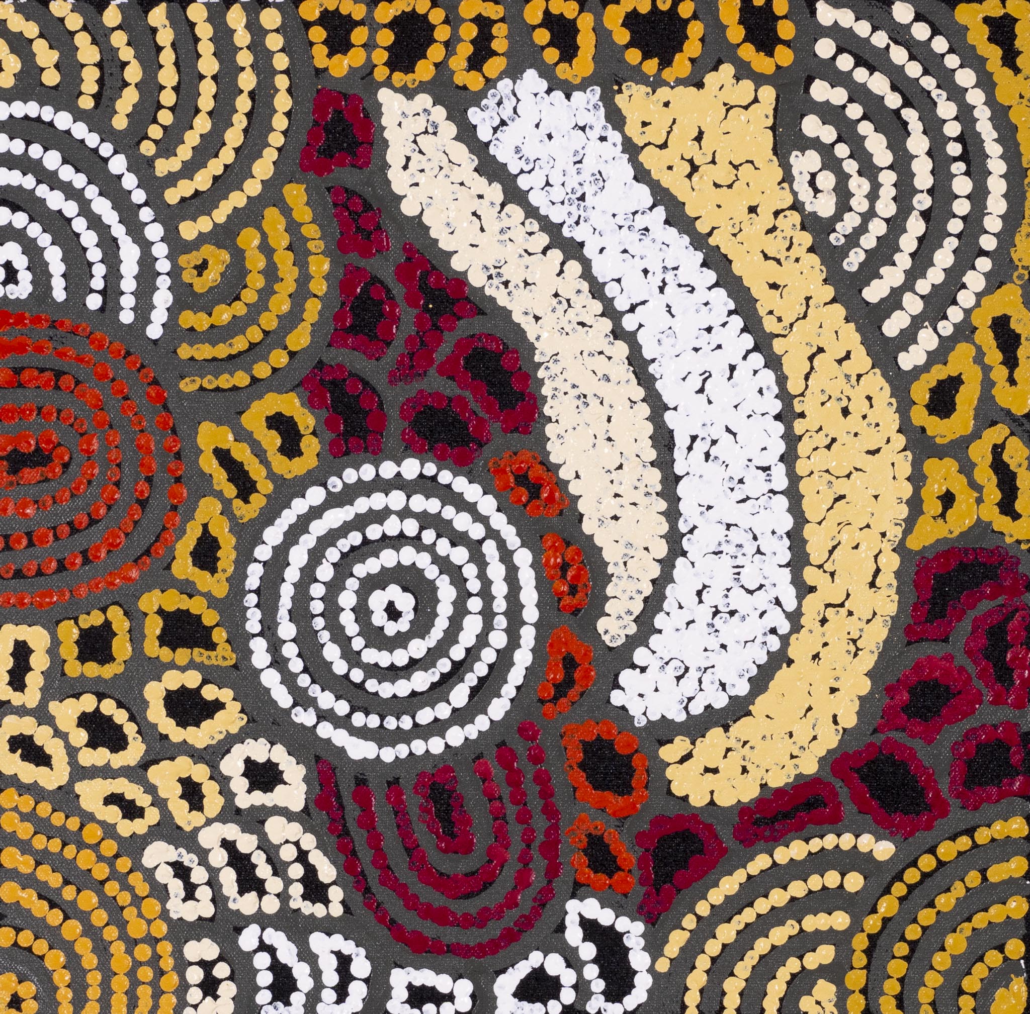 Nellie depicts ‘Women’s Ceremony’ and ‘My Country’ in her paintings. Most typically Nellie will paint a combination of these two Dreamings together. Nellie represents the women travelling across the country in her paintings with traditional iconography. Concentric circles are used to represent sacred women’s sites while linear patterns emerging from these circles represent the women travelling from sacred site to sacred site. Women’s body paint designs and the important bush tucker also feature heavily throughout Nellie’s artworks. Nellie has an incredibly strong aesthetic and combines rich earthy colours with a bright contemporary colour palette.