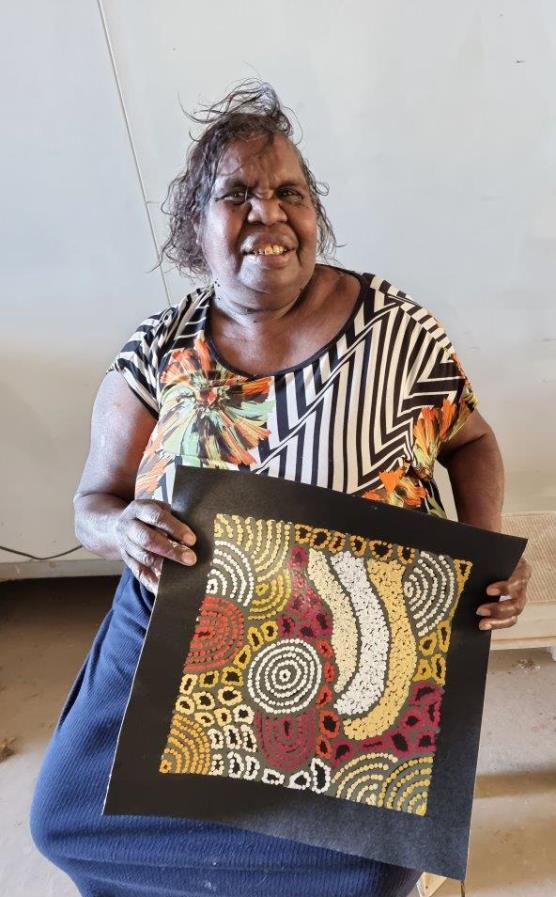 Nellie is naturally a quiet and shy woman, however her association with other famous artists has given her the confidence to enter into wider society so that she may now show the world her culture and her Dreamings as a successful artist.