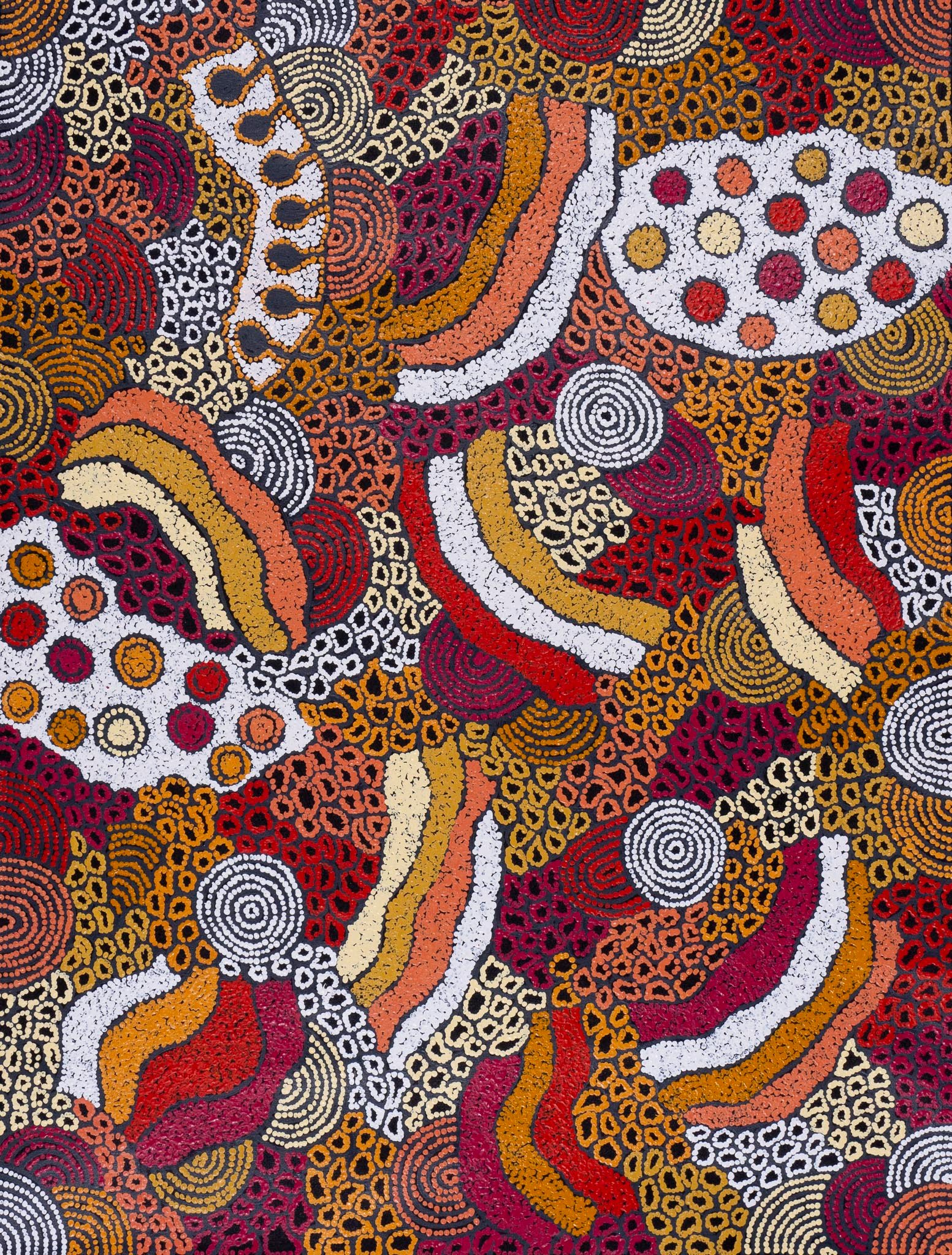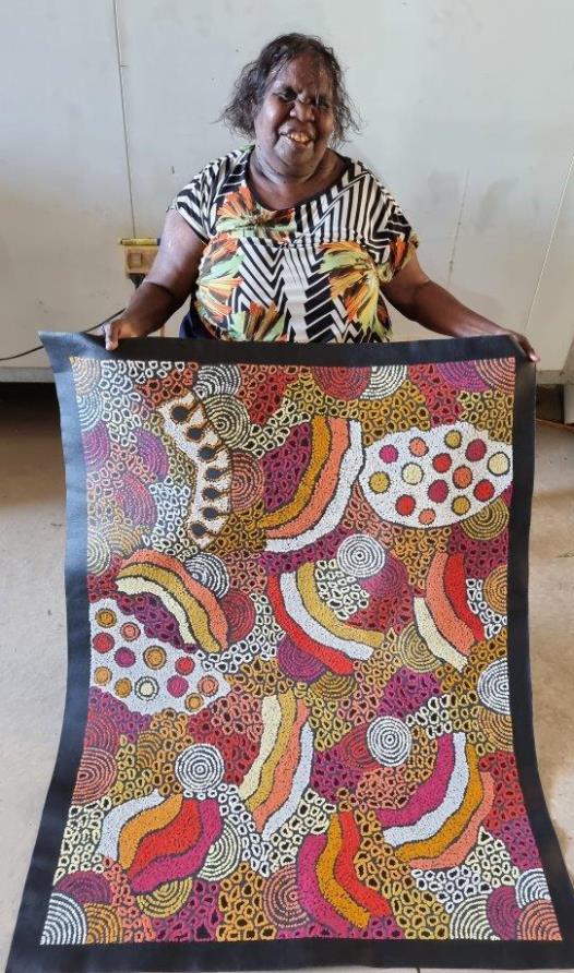 Painting in earthy tones she depicts women’s Lightning Dreaming, women’s ceremonies and women’s Tingari. One of Nellies better known stories is Kalimpinpa, which is the area she grew up in. The large rock hole at Kalimpinpa is a really deep rock hole. The men form a chain down to the water and scoop it up with a Coolamon and pass it up along the chain. This rock hole runs down under the ground and is difficult to access the water when there has been very little rain and the water level has dropped. Women’s body paint designs also feature heavily throughout Nellie’s artistic practice. Nellie enjoys experimenting with different colour palettes and has become incredibly confident in mixing colours for her works.