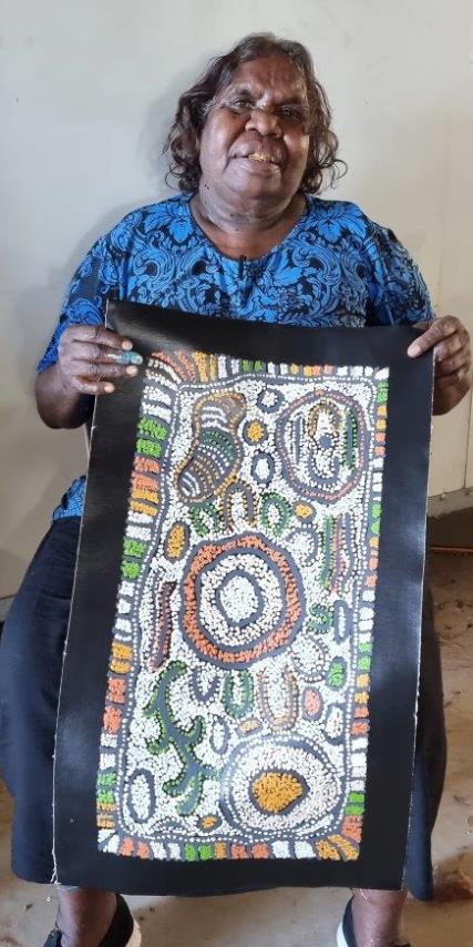 Nellie is naturally a quiet and shy woman, however her association with other famous artists has given her the confidence to enter into wider society so that she may now show the world her culture and her Dreamings as a successful artist.