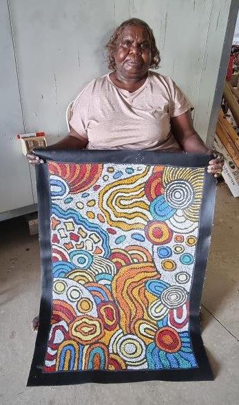 Painting in earthy tones she depicts women’s Lightning Dreaming, women’s ceremonies and women’s Tingari. One of Nellies better known stories is Kalimpinpa, which is the area she grew up in. The large rock hole at Kalimpinpa is a really deep rock hole. The men form a chain down to the water and scoop it up with a Coolamon and pass it up along the chain. This rock hole runs down under the ground and is difficult to access the water when there has been very little rain and the water level has dropped. Women’s body paint designs also feature heavily throughout Nellie’s artistic practice. Nellie enjoys experimenting with different colour palettes and has become incredibly confident in mixing colours for her works.