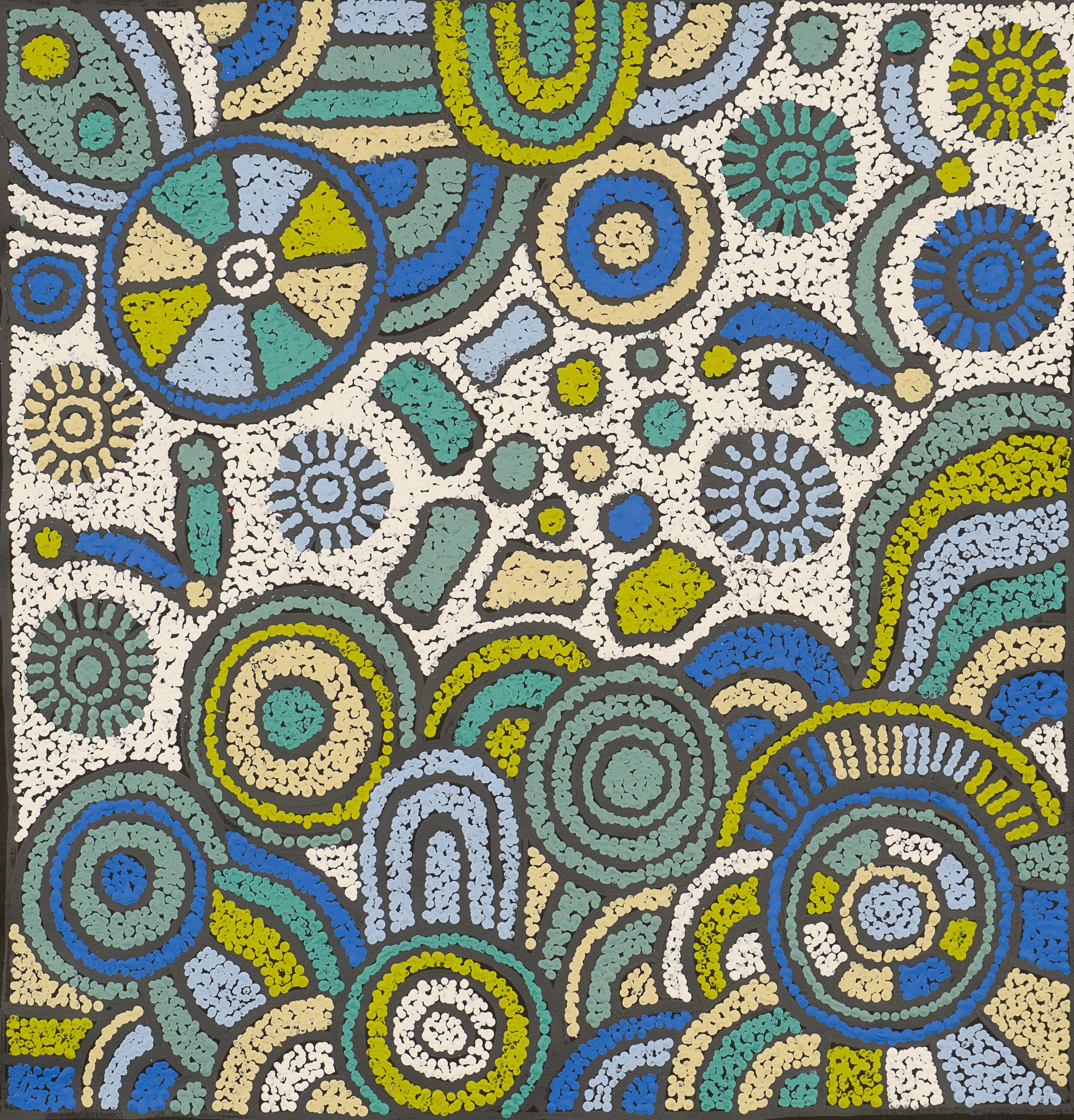 Nellie Marks Nakamarra was born in 1962 and is the younger sister of the renowned Central Australian artist Elizabeth Marks Nakamarra. Growing up with the same artistic influences they share a similar style and many of the same dreamings. Nellie was taught to paint by many of the founders of the desert art movement. Born in Papunya and growing up in the Western Desert, Nellie’s greatest artistic influences included Old Mick Namarrari, her step-father Turkey Tolson, Uta Uta and many others.Women’s Dreaming stories from the Western Desert form the basis of Nellie’s work. Showing her family as they move through the country collecting Medicines, water and Bush Tucker, Nellie portrays a fruitful land. The women travel through the bush teaching the children where to go to find these foods and medicines.