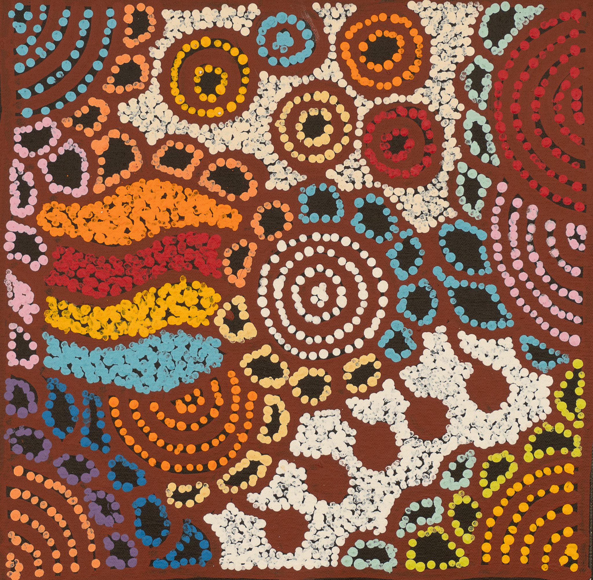 Nellie Marks Nakamarra was born in 1962 and is the younger sister of the renowned Central Australian artist Elizabeth Marks Nakamarra. Growing up with the same artistic influences they share a similar style and many of the same dreamings. Nellie was taught to paint by many of the founders of the desert art movement. Born in Papunya and growing up in the Western Desert, Nellie’s greatest artistic influences included Old Mick Namarrari, her step-father Turkey Tolson, Uta Uta and many others.Women’s Dreaming stories from the Western Desert form the basis of Nellie’s work. Showing her family as they move through the country collecting Medicines, water and Bush Tucker, Nellie portrays a fruitful land. The women travel through the bush teaching the children where to go to find these foods and medicines.
