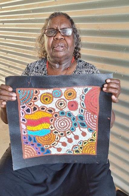 Nellie is naturally a quiet and shy woman, however her association with other famous artists has given her the confidence to enter into wider society so that she may now show the world her culture and her Dreamings as a successful artist.
