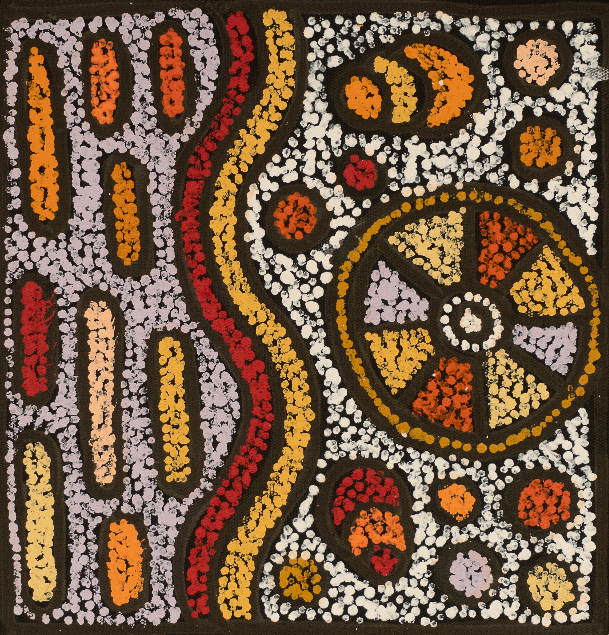 Nellie Marks Nakamarra was born in 1962 and is the younger sister of the renowned Central Australian artist Elizabeth Marks Nakamarra. Growing up with the same artistic influences they share a similar style and many of the same dreamings. Nellie was taught to paint by many of the founders of the desert art movement. Born in Papunya and growing up in the Western Desert, Nellie’s greatest artistic influences included Old Mick Namarrari, her step-father Turkey Tolson, Uta Uta and many others.Women’s Dreaming stories from the Western Desert form the basis of Nellie’s work. Showing her family as they move through the country collecting Medicines, water and Bush Tucker, Nellie portrays a fruitful land. The women travel through the bush teaching the children where to go to find these foods and medicines.