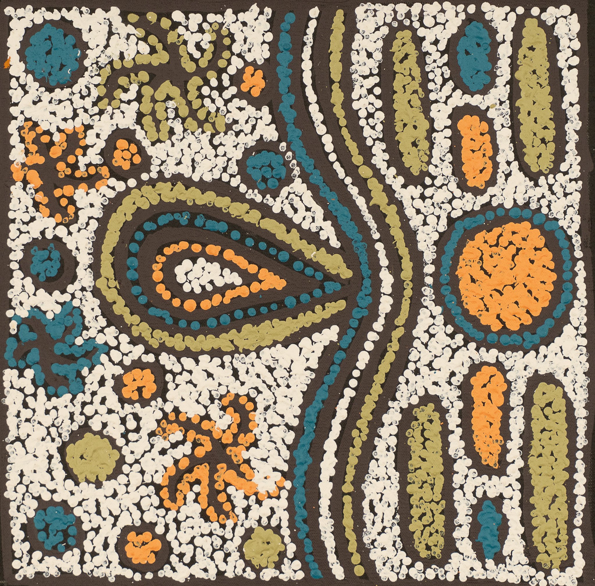 Nellie Marks Nakamarra was born in 1962 and is the younger sister of the renowned Central Australian artist Elizabeth Marks Nakamarra. Growing up with the same artistic influences they share a similar style and many of the same dreamings. Nellie was taught to paint by many of the founders of the desert art movement. Born in Papunya and growing up in the Western Desert, Nellie’s greatest artistic influences included Old Mick Namarrari, her step-father Turkey Tolson, Uta Uta and many others.Women’s Dreaming stories from the Western Desert form the basis of Nellie’s work. Showing her family as they move through the country collecting Medicines, water and Bush Tucker, Nellie portrays a fruitful land. The women travel through the bush teaching the children where to go to find these foods and medicines.