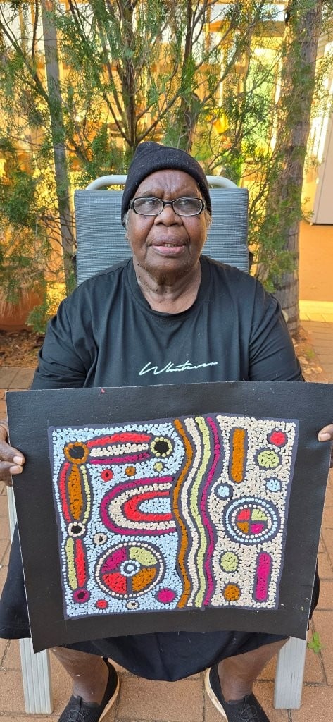Painting in earthy tones she depicts women’s Lightning Dreaming, women’s ceremonies and women’s Tingari. One of Nellies better known stories is Kalimpinpa, which is the area she grew up in. The large rock hole at Kalimpinpa is a really deep rock hole. The men form a chain down to the water and scoop it up with a Coolamon and pass it up along the chain. This rock hole runs down under the ground and is difficult to access the water when there has been very little rain and the water level has dropped. Women’s body paint designs also feature heavily throughout Nellie’s artistic practice. Nellie enjoys experimenting with different colour palettes and has become incredibly confident in mixing colours for her works.