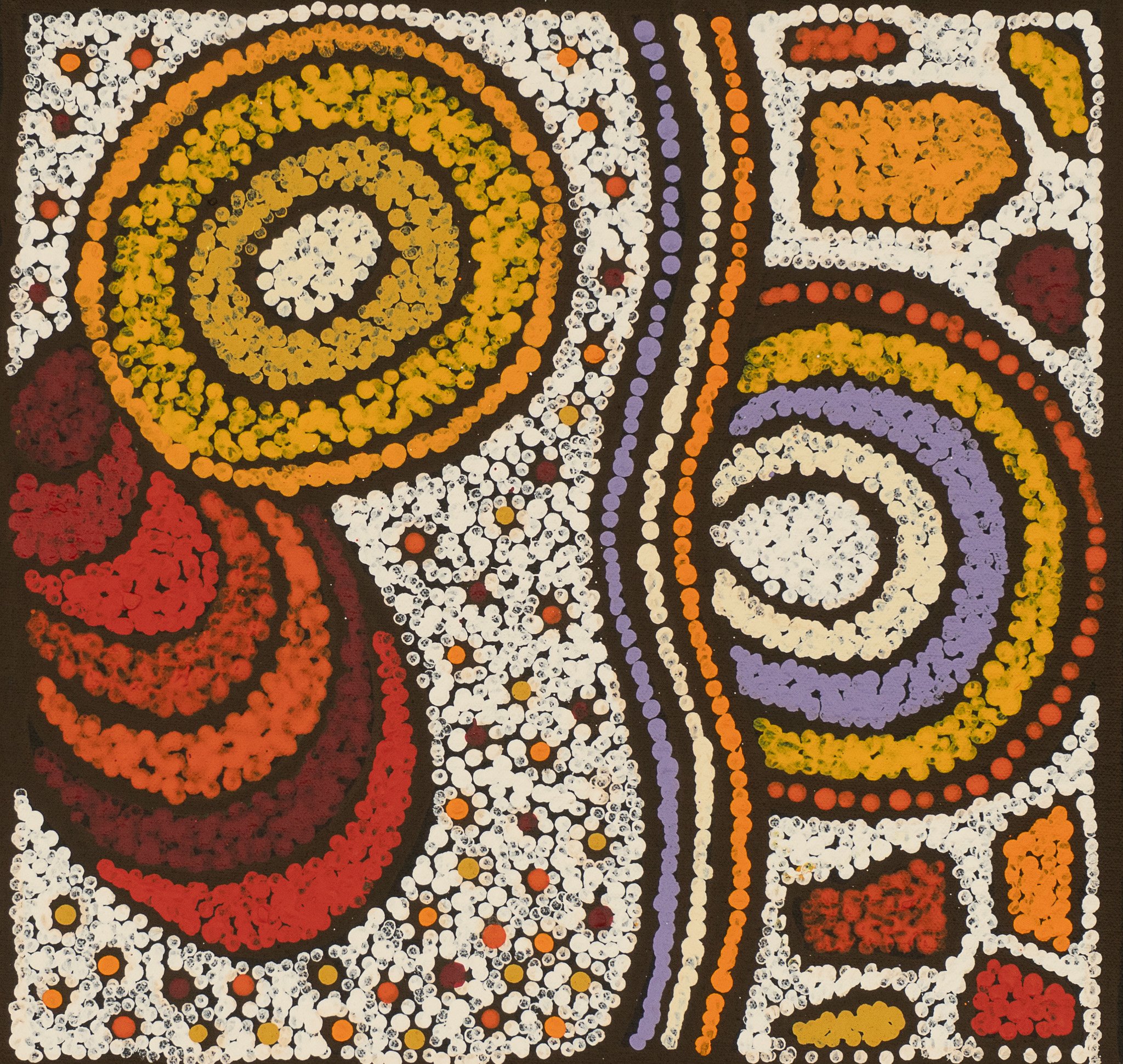 Nellie represents the women travelling across the country in her paintings with traditional iconography. Concentric circles are used to represent sacred women’s sites while linear patterns emerging from these circles represent the women travelling from sacred site to sacred site.