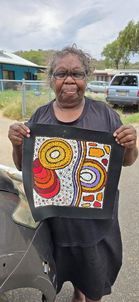 Painting in earthy tones she depicts women’s Lightning Dreaming, women’s ceremonies and women’s Tingari. One of Nellies better known stories is Kalimpinpa, which is the area she grew up in. The large rock hole at Kalimpinpa is a really deep rock hole. The men form a chain down to the water and scoop it up with a Coolamon and pass it up along the chain. This rock hole runs down under the ground and is difficult to access the water when there has been very little rain and the water level has dropped. Women’s body paint designs also feature heavily throughout Nellie’s artistic practice. Nellie enjoys experimenting with different colour palettes and has become incredibly confident in mixing colours for her works.