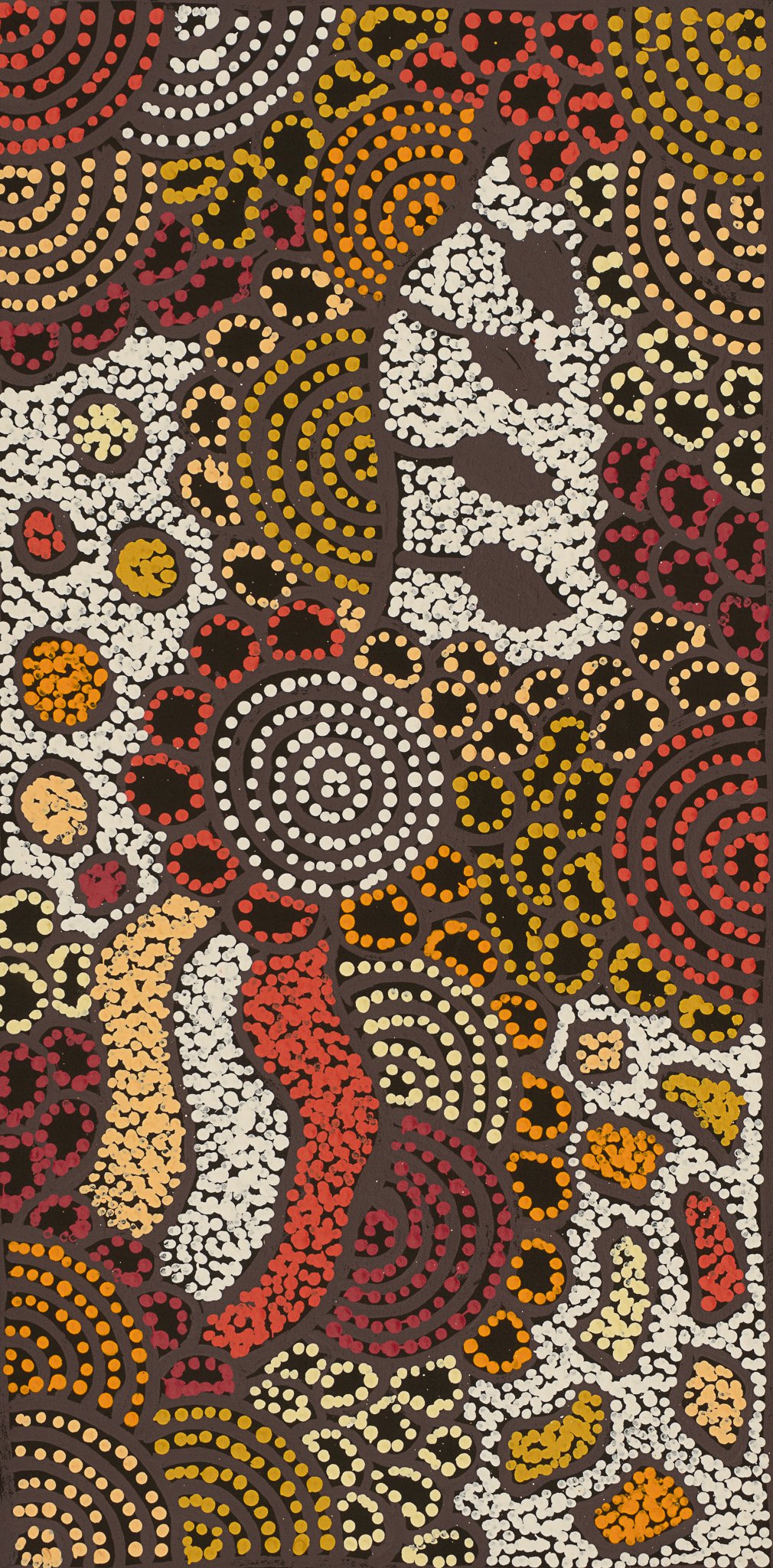 Nellie Marks Nakamarra was born in 1962 and is the younger sister of the renowned Central Australian artist Elizabeth Marks Nakamarra. Growing up with the same artistic influences they share a similar style and many of the same dreamings. Nellie was taught to paint by many of the founders of the desert art movement. Born in Papunya and growing up in the Western Desert, Nellie’s greatest artistic influences included Old Mick Namarrari, her step-father Turkey Tolson, Uta Uta and many others.Women’s Dreaming stories from the Western Desert form the basis of Nellie’s work. Showing her family as they move through the country collecting Medicines, water and Bush Tucker, Nellie portrays a fruitful land. The women travel through the bush teaching the children where to go to find these foods and medicines.