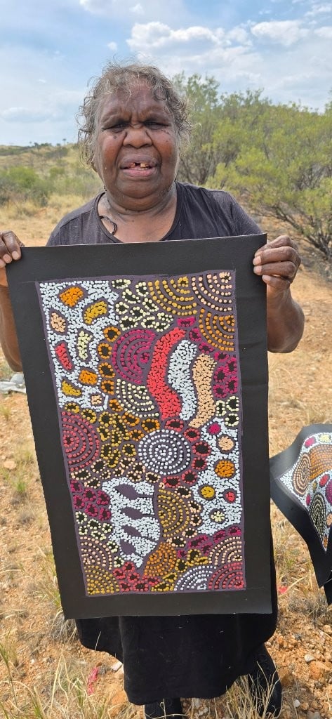 Painting in earthy tones she depicts women’s Lightning Dreaming, women’s ceremonies and women’s Tingari. One of Nellies better known stories is Kalimpinpa, which is the area she grew up in. The large rock hole at Kalimpinpa is a really deep rock hole. The men form a chain down to the water and scoop it up with a Coolamon and pass it up along the chain. This rock hole runs down under the ground and is difficult to access the water when there has been very little rain and the water level has dropped. Women’s body paint designs also feature heavily throughout Nellie’s artistic practice. Nellie enjoys experimenting with different colour palettes and has become incredibly confident in mixing colours for her works.