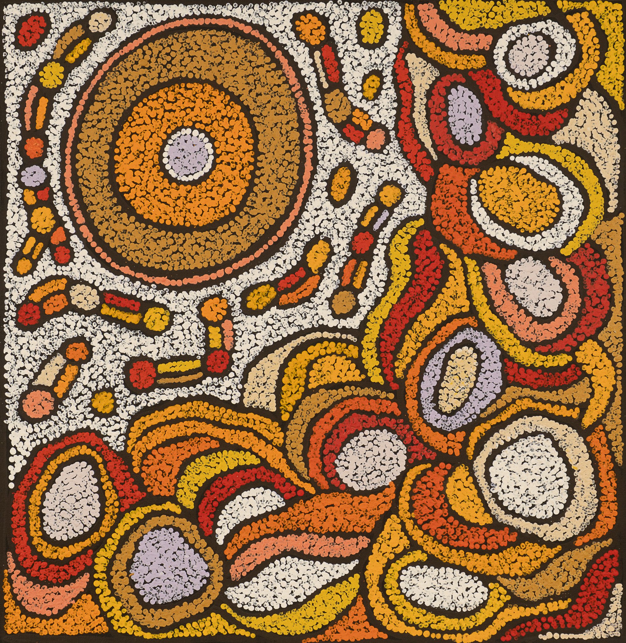 Nellie Marks Nakamarra was born in 1962 and is the younger sister of the renowned Central Australian artist Elizabeth Marks Nakamarra. Growing up with the same artistic influences they share a similar style and many of the same dreamings. Nellie was taught to paint by many of the founders of the desert art movement. Born in Papunya and growing up in the Western Desert, Nellie’s greatest artistic influences included Old Mick Namarrari, her step-father Turkey Tolson, Uta Uta and many others.Women’s Dreaming stories from the Western Desert form the basis of Nellie’s work. Showing her family as they move through the country collecting Medicines, water and Bush Tucker, Nellie portrays a fruitful land. The women travel through the bush teaching the children where to go to find these foods and medicines.