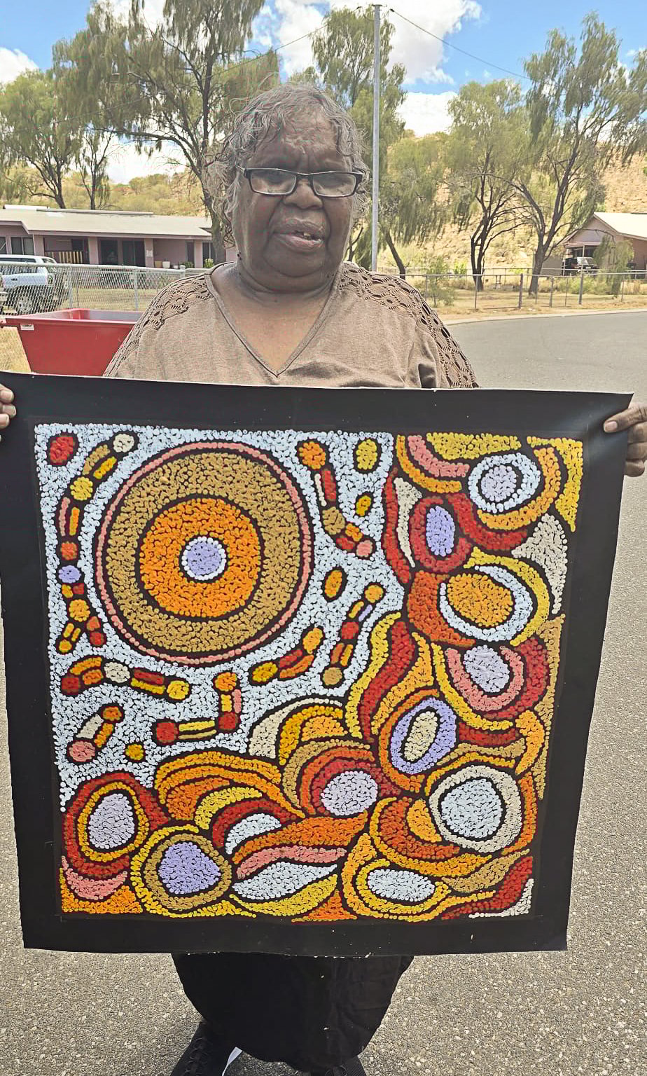 Painting in earthy tones she depicts women’s Lightning Dreaming, women’s ceremonies and women’s Tingari. One of Nellies better known stories is Kalimpinpa, which is the area she grew up in. The large rock hole at Kalimpinpa is a really deep rock hole. The men form a chain down to the water and scoop it up with a Coolamon and pass it up along the chain. This rock hole runs down under the ground and is difficult to access the water when there has been very little rain and the water level has dropped. Women’s body paint designs also feature heavily throughout Nellie’s artistic practice. Nellie enjoys experimenting with different colour palettes and has become incredibly confident in mixing colours for her works.