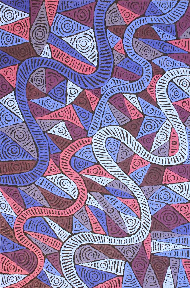 Mina Mina is the area or country this painting is depicting. It is far west of Yuendumu and is very important to the Napangardi / Napanangka women. These women and their Japangardi / Japanangka brothers, are the custodians of the Jukurrpa that created the area. This story (Dreaming) tells of the journey of a group of women who travelled east gathering food, ‘ngalyipi’ (snake vine) and performing ceremonies as they journeyed.