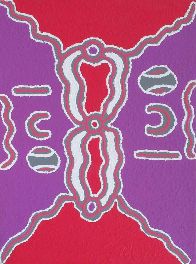 The site depicted in this painting is Pirlinyarnu (Mt. Farewell), about 165 km west of Yuendumu in the Northern Territory. Two Jangala men, rainmakers, sang the rain, unleashing a giant storm that collided with another storm from Wapurtali. The two storms travelled across the country, from Karlipinpa near Kintore. A Kirrkarlanji (brown falcon [Falco berigora]) carried the storm further west until it dropped the storm at Pirlinyarnu, forming an enormous Maliri (lake). A “mulju” (soakage) exists in this place today. At Puyurru the bird dug up a ‘warnayarra’ (rainbow serpent). The serpent carried water with it to create another large lake. Whenever it rains today hundreds of ‘ngapangarlpa’ (bush ducks) still flock to Pirlinyarnu. The ‘kirda’ (custodians) for this Jukurrpa are Jangala/Jampijinpa men and Nangala/ Nampijinpa women.