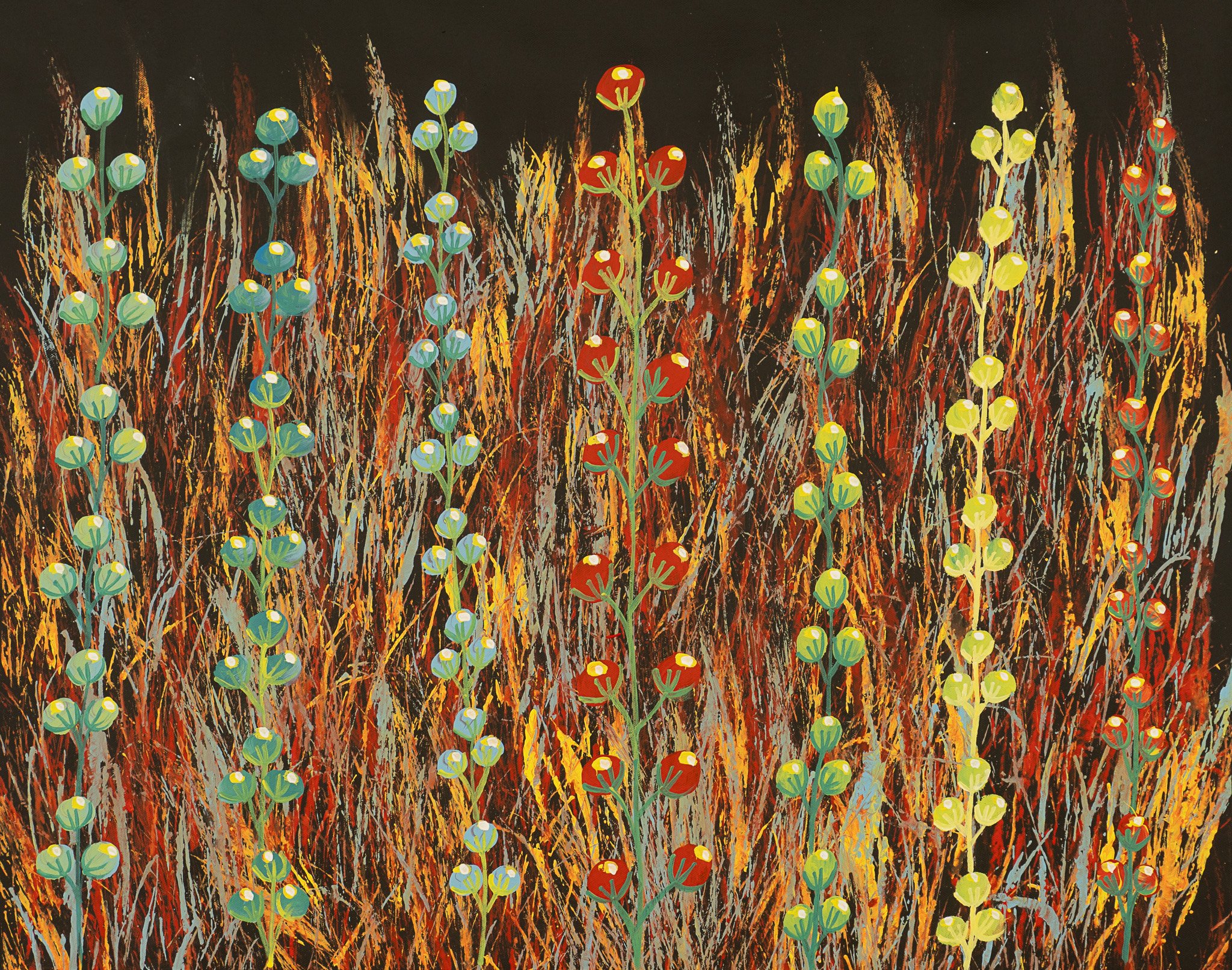 Using a black background overlaid with spear grass and drawing on his own experience of the bush, Reggie’s paintings tell stories of hunting, gathering bush tucker and traditional Aboriginal lifestyles. In this artwork, Reggie uses a range of colours on a black canvas finishing the work off with the beautiful bush fruits found in his country which were integral to his ancestor’s diets. Reggie and his family still go out and collect bush fruits to this day.