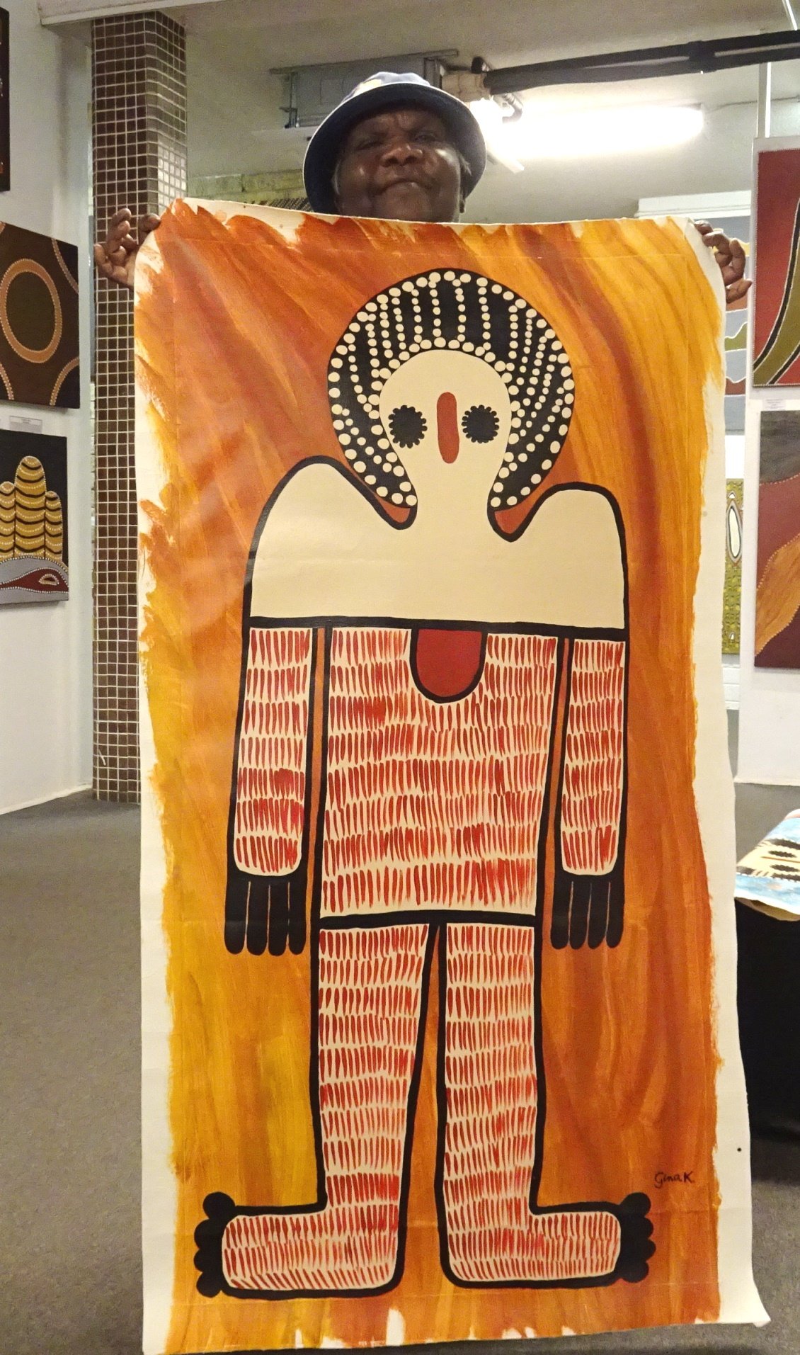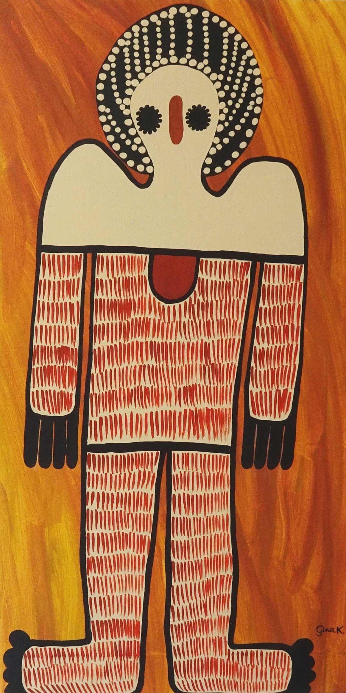 Regina is the eldest daughter of the late Rosie Karadada, a prominent artist and artefact maker. Rosie’s brother was senior artist and lawman Alex Mingelmanganu. Regina’s father Louis Karadada, and his brother Jack, were renowned artists and artefact makers also. Regina’s aunty is Lily Karadada, who is undoubtedly one of Australia’s most important contemporary aboriginal artists.