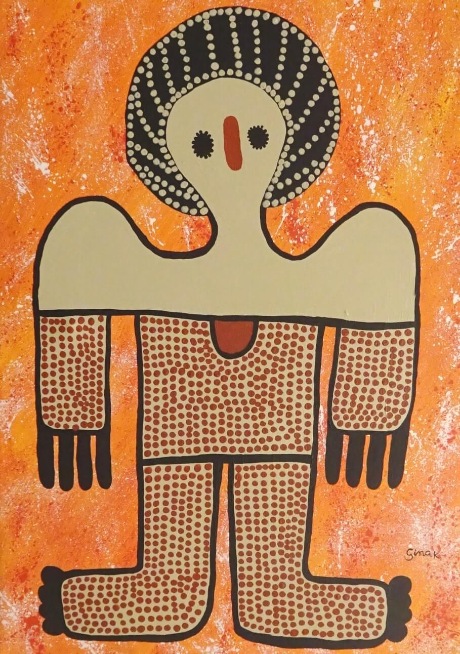 Regina was inspired to start painting in the late 1980’s after years of watching and learning from her talented family. Regina paints the Wandjina and Gwion Gwion rock art which is abundant in her region on canvas and the highly sought after eucalyptus bark and is a clever artefact maker like her mother and father, her Uncle Jack and Aunt Lily.