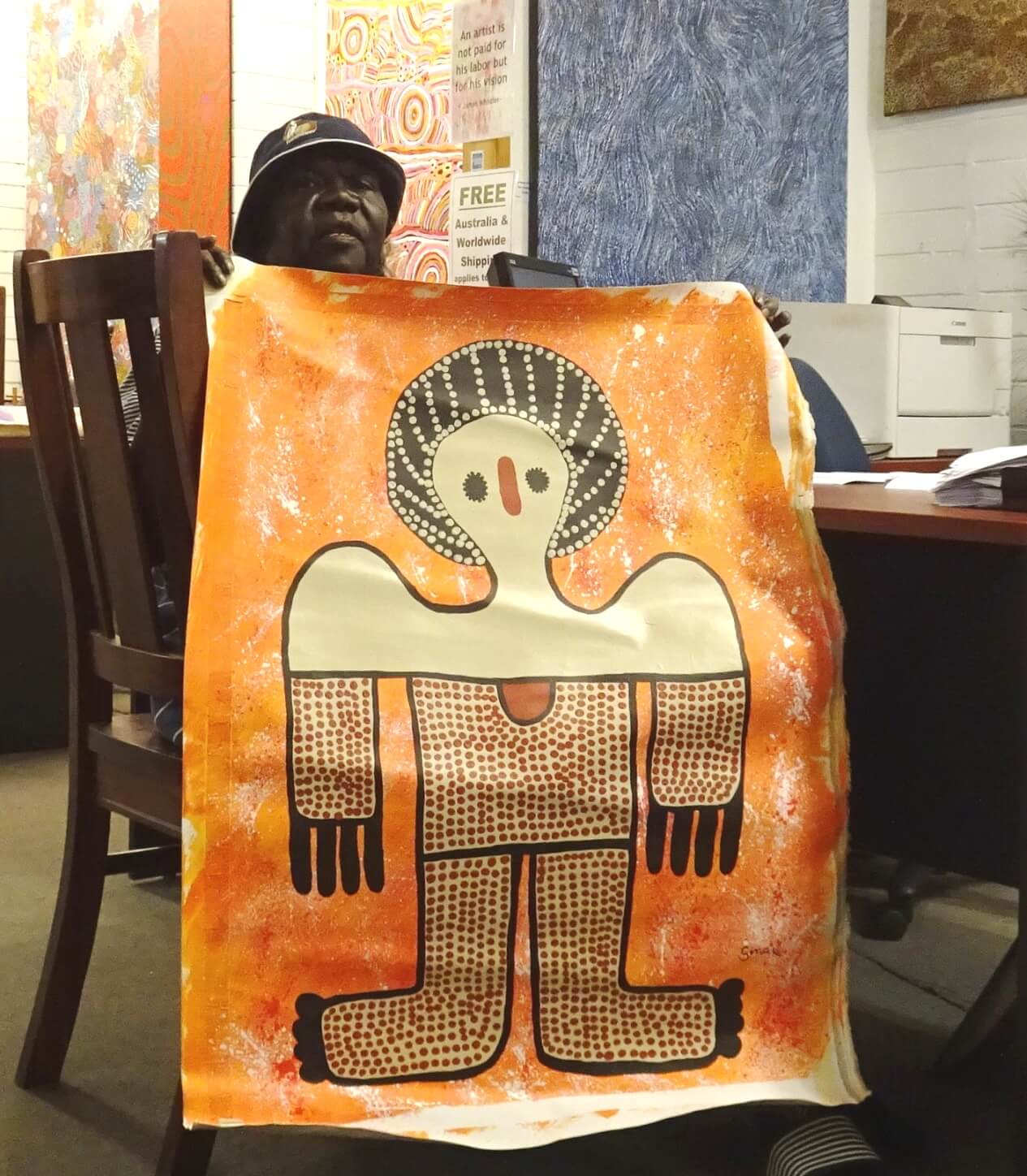 Regina is the eldest daughter of the late Rosie Karadada, a prominent artist and artefact maker. Rosie’s brother was senior artist and lawman Alex Mingelmanganu. Regina’s father Louis Karadada, and his brother Jack, were renowned artists and artefact makers also. Regina’s aunty is Lily Karadada, who is undoubtedly one of Australia’s most important contemporary aboriginal artists.