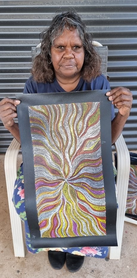 In the late 1990s, Rita embarked on her painting journey under the guidance of her renowned aunt, Abie Loy and famous great aunties Kathleen and Gloria Petyarre. While focusing on raising her children, she painted sporadically for many years, but has now reignited her passion, painting regularly once more.