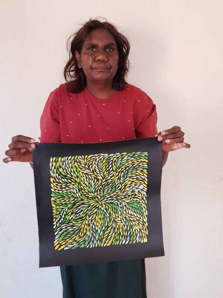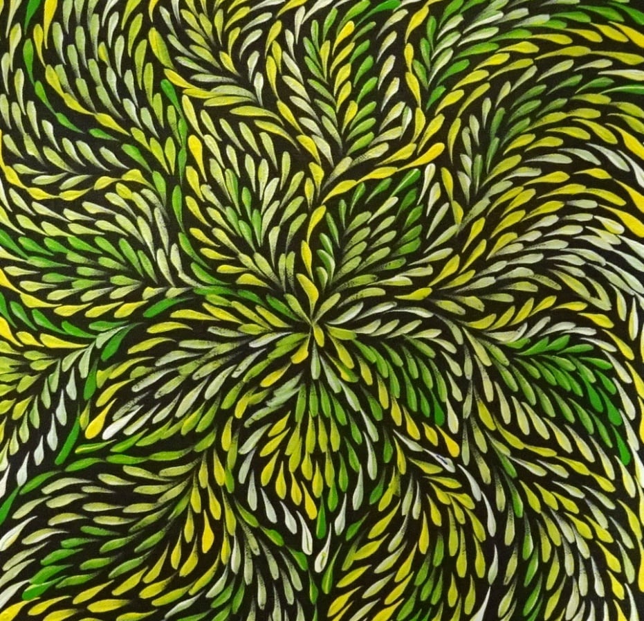 Roseanne paints the Desert Yam (or Bush Plum) story from her family’s country. The yam grows underground with its viny shrub growing above ground up to one metre high. It is normally found on Spinifex sand plains and produces large flowers after summer rain. The yam is a tuber, or swollen root, of the shrub and tastes much like the common sweet potato. It can be eaten raw or cooked and is still a staple food for the desert aborigines where it can be harvested at any time of the year. It is also renowned for its medicinal properties. This medicine is used to heal cuts, wounds, bites, rashes and as an insect repellent. In this painting, Roseanne depicts the leaves of the yam paying homage to the spirit of this special plant in the hope that it will regenerate.