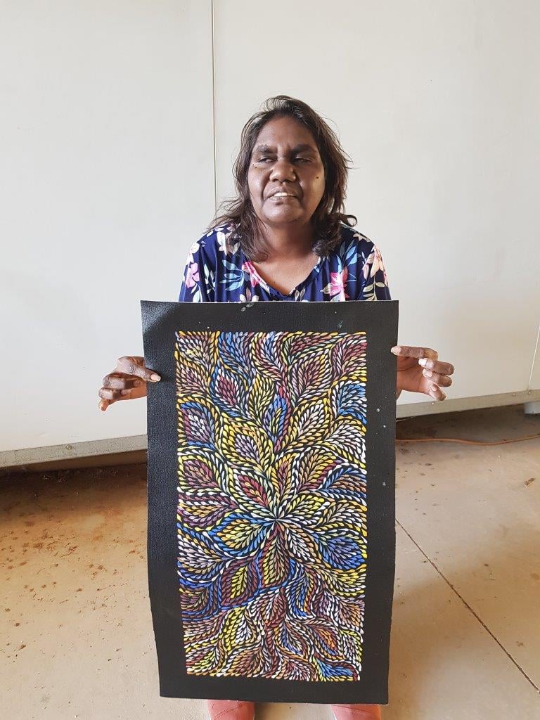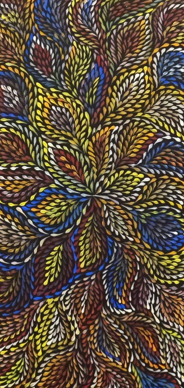 Roseanne paints the Desert Yam (or Bush Plum) story from her family’s country. The yam grows underground with its viny shrub growing above ground up to one metre high. It is normally found on Spinifex sand plains and produces large flowers after summer rain. The yam is a tuber, or swollen root, of the shrub and tastes much like the common sweet potato. It can be eaten raw or cooked and is still a staple food for the desert aborigines where it can be harvested at any time of the year. It is also renowned for its medicinal properties. This medicine is used to heal cuts, wounds, bites, rashes and as an insect repellent. In this painting, Roseanne depicts the leaves of the yam paying homage to the spirit of this special plant in the hope that it will regenerate.