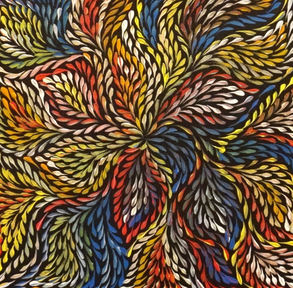 Roseanne paints the Desert Yam (or Bush Plum) story from her family’s country. The yam grows underground with its viny shrub growing above ground up to one metre high. It is normally found on Spinifex sand plains and produces large flowers after summer rain. The yam is a tuber, or swollen root, of the shrub and tastes much like the common sweet potato. It can be eaten raw or cooked and is still a staple food for the desert aborigines where it can be harvested at any time of the year. It is also renowned for its medicinal properties. This medicine is used to heal cuts, wounds, bites, rashes and as an insect repellent. In this painting, Roseanne depicts the leaves of the yam paying homage to the spirit of this special plant in the hope that it will regenerate.