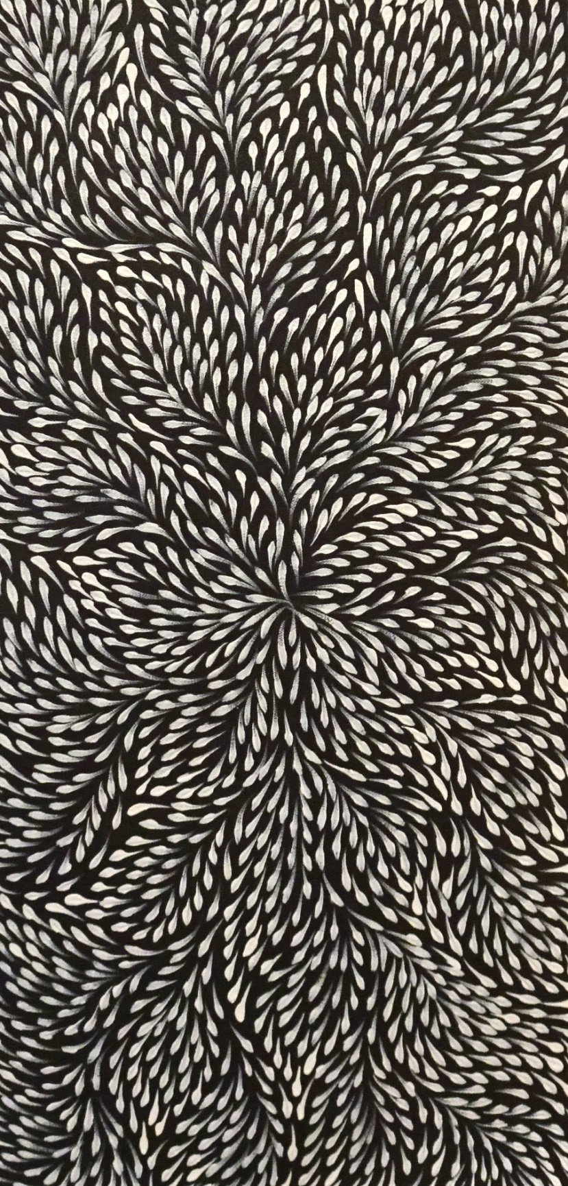 Roseanne paints the Desert Yam (or Bush Plum) story from her family’s country. The yam grows underground with its viny shrub growing above ground up to one metre high. It is normally found on Spinifex sand plains and produces large flowers after summer rain. The yam is a tuber, or swollen root, of the shrub and tastes much like the common sweet potato. It can be eaten raw or cooked and is still a staple food for the desert aborigines where it can be harvested at any time of the year. It is also renowned for its medicinal properties. This medicine is used to heal cuts, wounds, bites, rashes and as an insect repellent. In this painting, Roseanne depicts the leaves of the yam paying homage to the spirit of this special plant in the hope that it will regenerate.