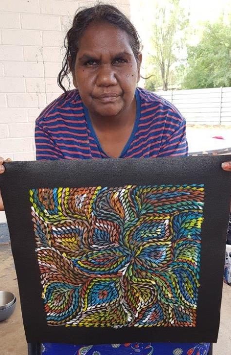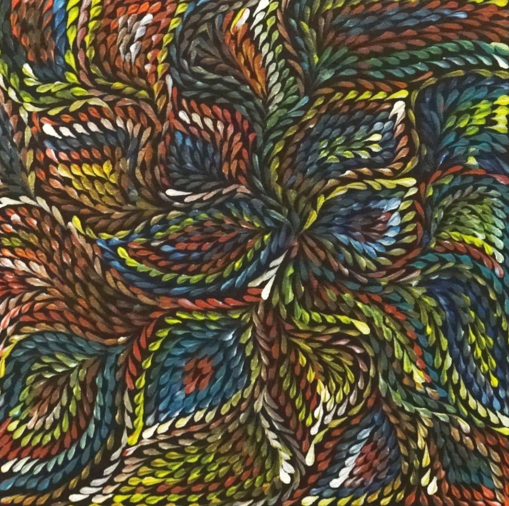 Roseanne paints the Desert Yam (or Bush Plum) story from her family’s country. The yam grows underground with its viny shrub growing above ground up to one metre high. It is normally found on Spinifex sand plains and produces large flowers after summer rain. The yam is a tuber, or swollen root, of the shrub and tastes much like the common sweet potato. It can be eaten raw or cooked and is still a staple food for the desert aborigines where it can be harvested at any time of the year. It is also renowned for its medicinal properties. This medicine is used to heal cuts, wounds, bites, rashes and as an insect repellent. In this painting, Roseanne depicts the leaves of the yam paying homage to the spirit of this special plant in the hope that it will regenerate.