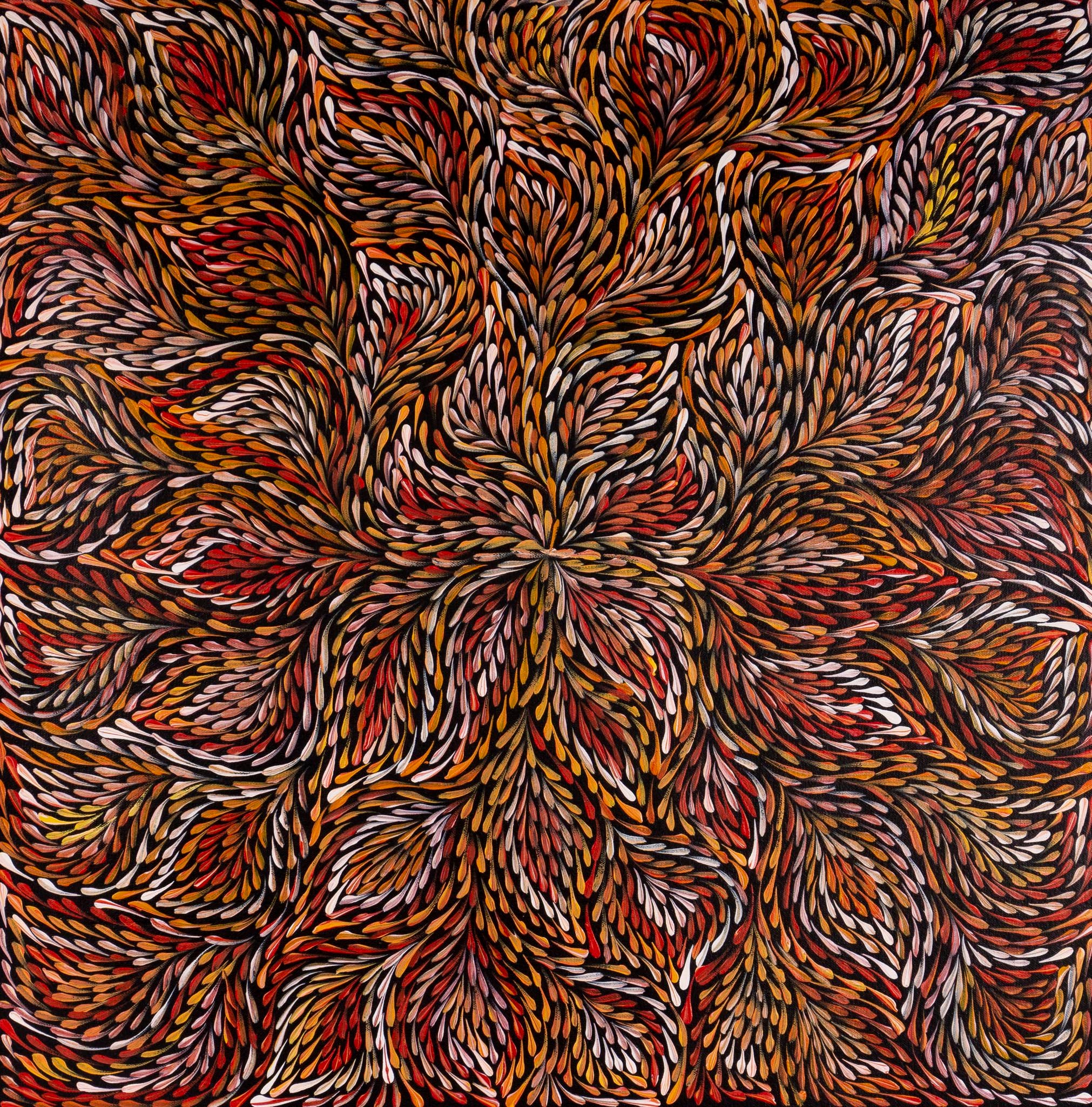 Roseanne paints the Desert Yam (or Bush Plum) story from her family’s country. The yam grows underground with its viny shrub growing above ground up to one metre high. It is normally found on Spinifex sand plains and produces large flowers after summer rain. The yam is a tuber, or swollen root, of the shrub and tastes much like the common sweet potato. It can be eaten raw or cooked and is still a staple food for the desert aborigines where it can be harvested at any time of the year. It is also renowned for its medicinal properties. This medicine is used to heal cuts, wounds, bites, rashes and as an insect repellent. In this painting, Roseanne depicts the leaves of the yam paying homage to the spirit of this special plant in the hope that it will regenerate.