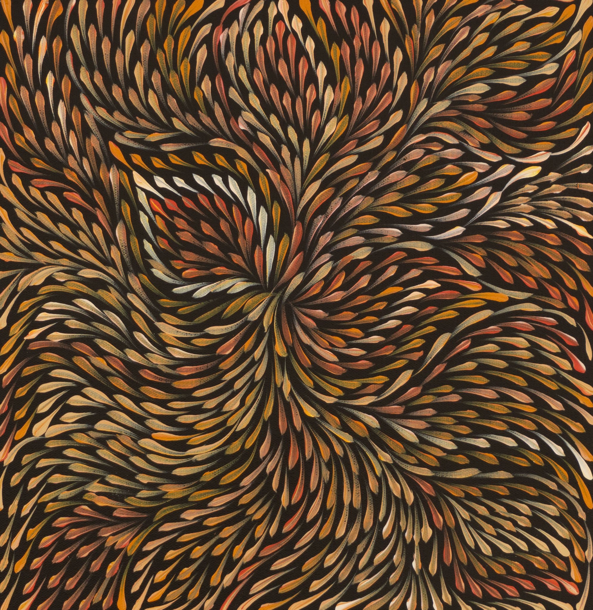 Roseanne paints the Desert Yam (or Bush Plum) story from her family’s country. The yam grows underground with its viny shrub growing above ground up to one metre high. It is normally found on Spinifex sand plains and produces large flowers after summer rain. The yam is a tuber, or swollen root, of the shrub and tastes much like the common sweet potato. It can be eaten raw or cooked and is still a staple food for the desert aborigines where it can be harvested at any time of the year. It is also renowned for its medicinal properties. This medicine is used to heal cuts, wounds, bites, rashes and as an insect repellent. In this painting, Roseanne depicts the leaves of the yam paying homage to the spirit of this special plant in the hope that it will regenerate.
