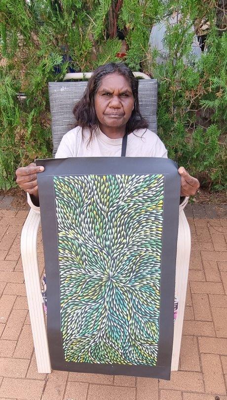 Roseanne paints the Desert Yam (or Bush Plum) story from her family’s country. The yam grows underground with its viny shrub growing above ground up to one metre high. It is normally found on Spinifex sand plains and produces large flowers after summer rain. The yam is a tuber, or swollen root, of the shrub and tastes much like the common sweet potato. It can be eaten raw or cooked and is still a staple food for the desert aborigines where it can be harvested at any time of the year. It is also renowned for its medicinal properties. This medicine is used to heal cuts, wounds, bites, rashes and as an insect repellent. In this painting, Roseanne depicts the leaves of the yam paying homage to the spirit of this special plant in the hope that it will regenerate.