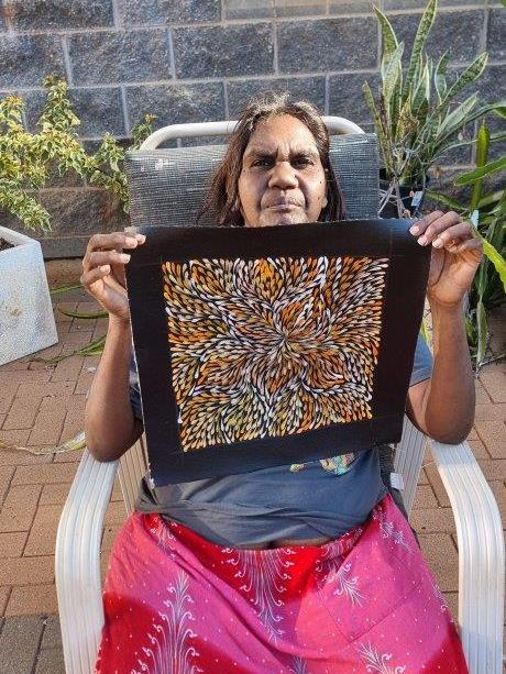 Roseanne paints the Desert Yam (or Bush Plum) story from her family’s country.