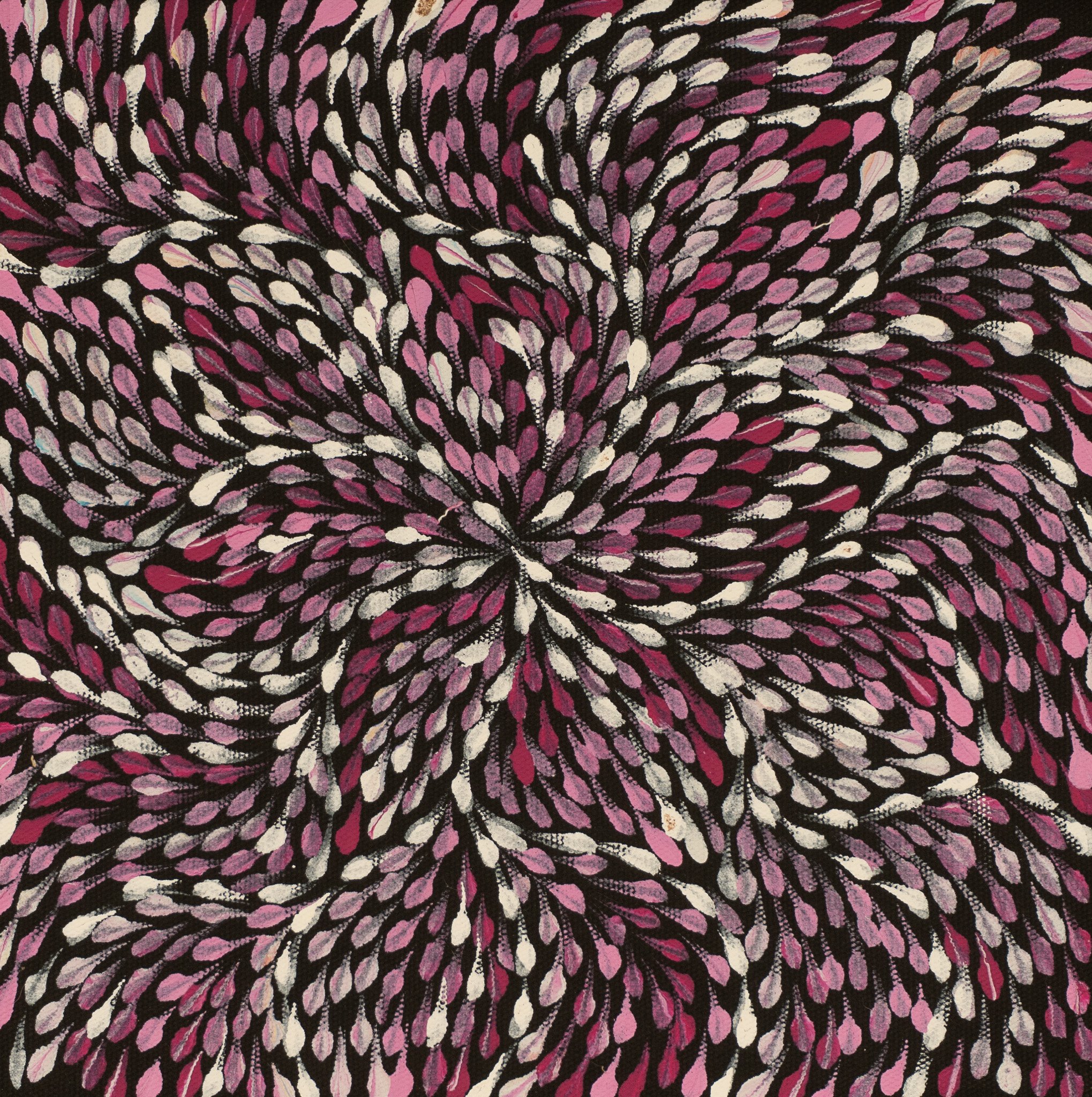 From a young age, Roseanne absorbed the cultural knowledge and artistic skills passed down through her mother, aunties, and grandmothers. She paints the Anwekety (Bush Plum) Dreaming, just as her mother did — a story of deep cultural significance involving ceremony, ancestral connections, and the seasonal cycles of this important bush food.