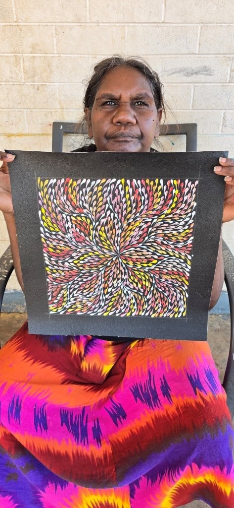 From a young age, Roseanne absorbed the cultural knowledge and artistic skills passed down through her mother, aunties, and grandmothers. She paints the Anwekety (Bush Plum) Dreaming, just as her mother did — a story of deep cultural significance involving ceremony, ancestral connections, and the seasonal cycles of this important bush food.
