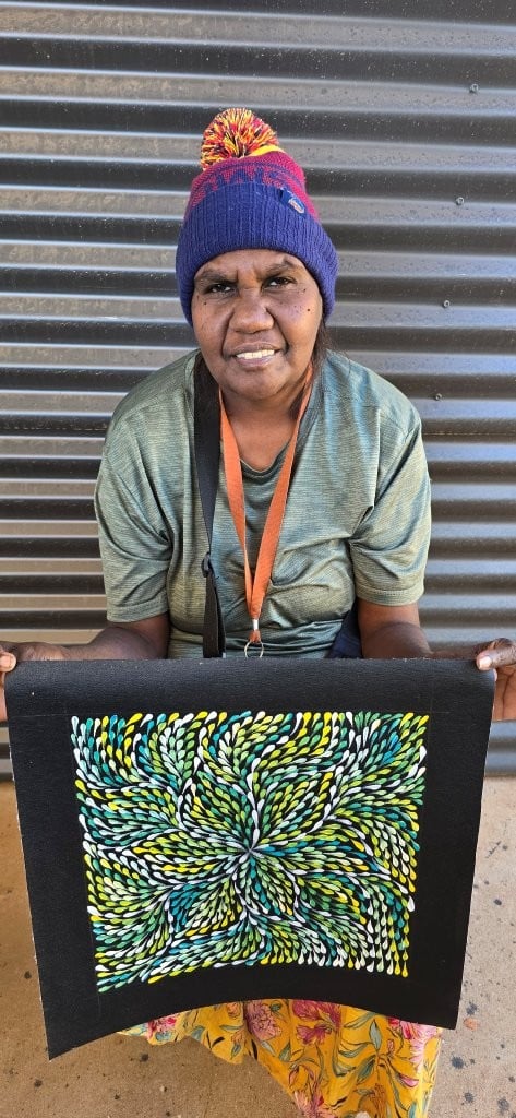 Roseanne paints the Desert Yam (or Bush Plum) story from her family’s country.