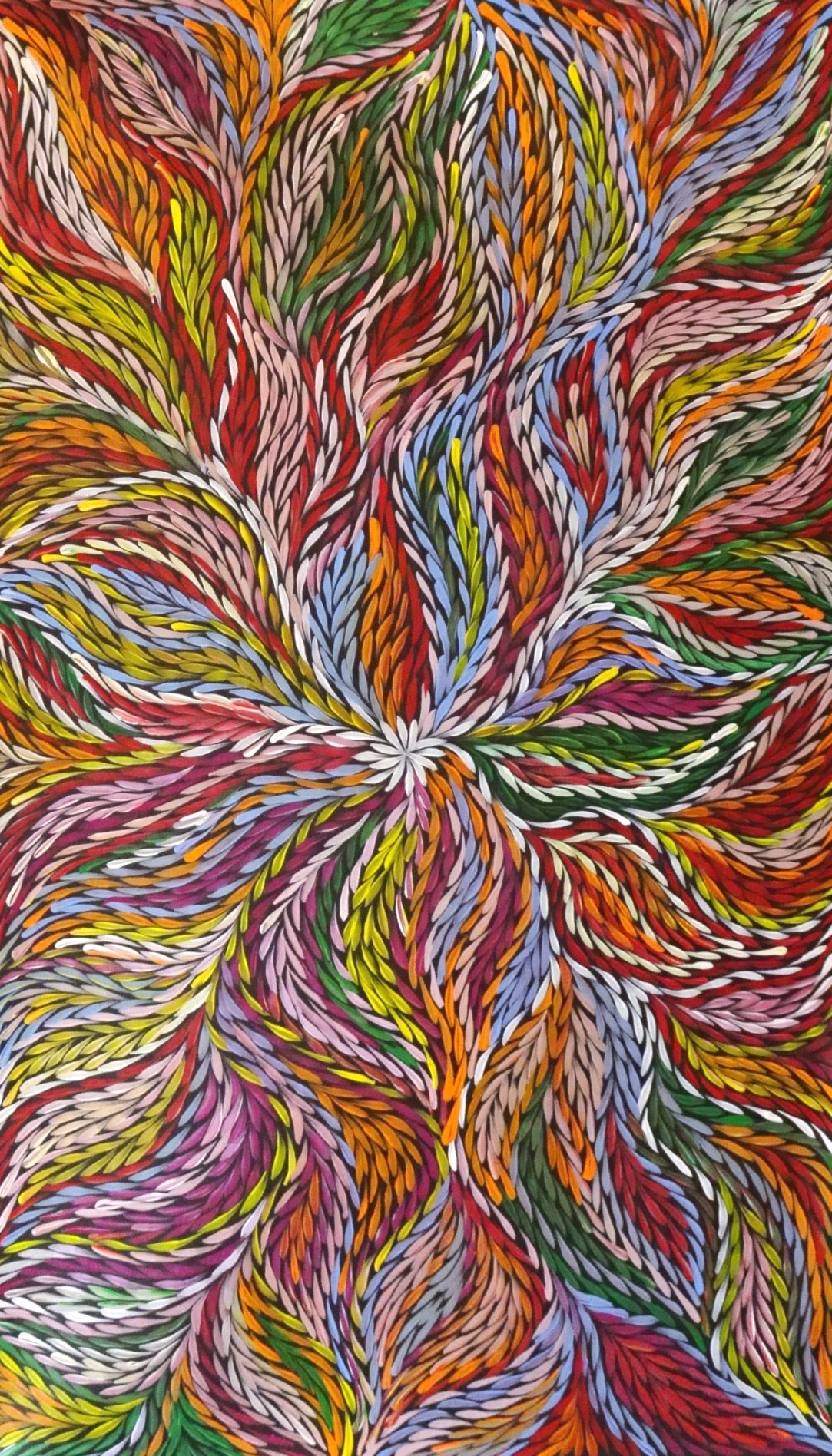 As a bush woman, she is familiar with her land and its abundance of bush tucker species, medicine plants and native fauna. The stories related to the bush tucker have been inherited by her, along with important women’s stories and form the basis of her paintings.