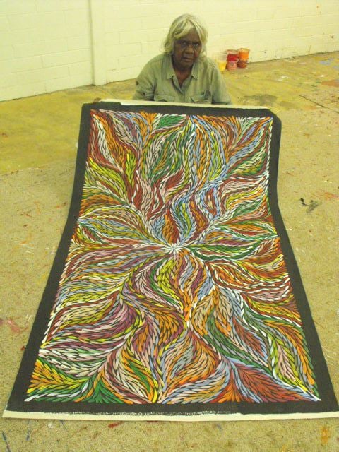 Rosemary was one of a group of Anmatyerre women at the forefront of the art movement in the Utopia area. She was amongst a small group of women who travelled to Indonesia to learn various techniques in the manufacturing of batiks. It was after the “summer project” sponsored by the CAAMA network in 1998 that Rosemary spread her wings and started painting with acrylics and canvas.